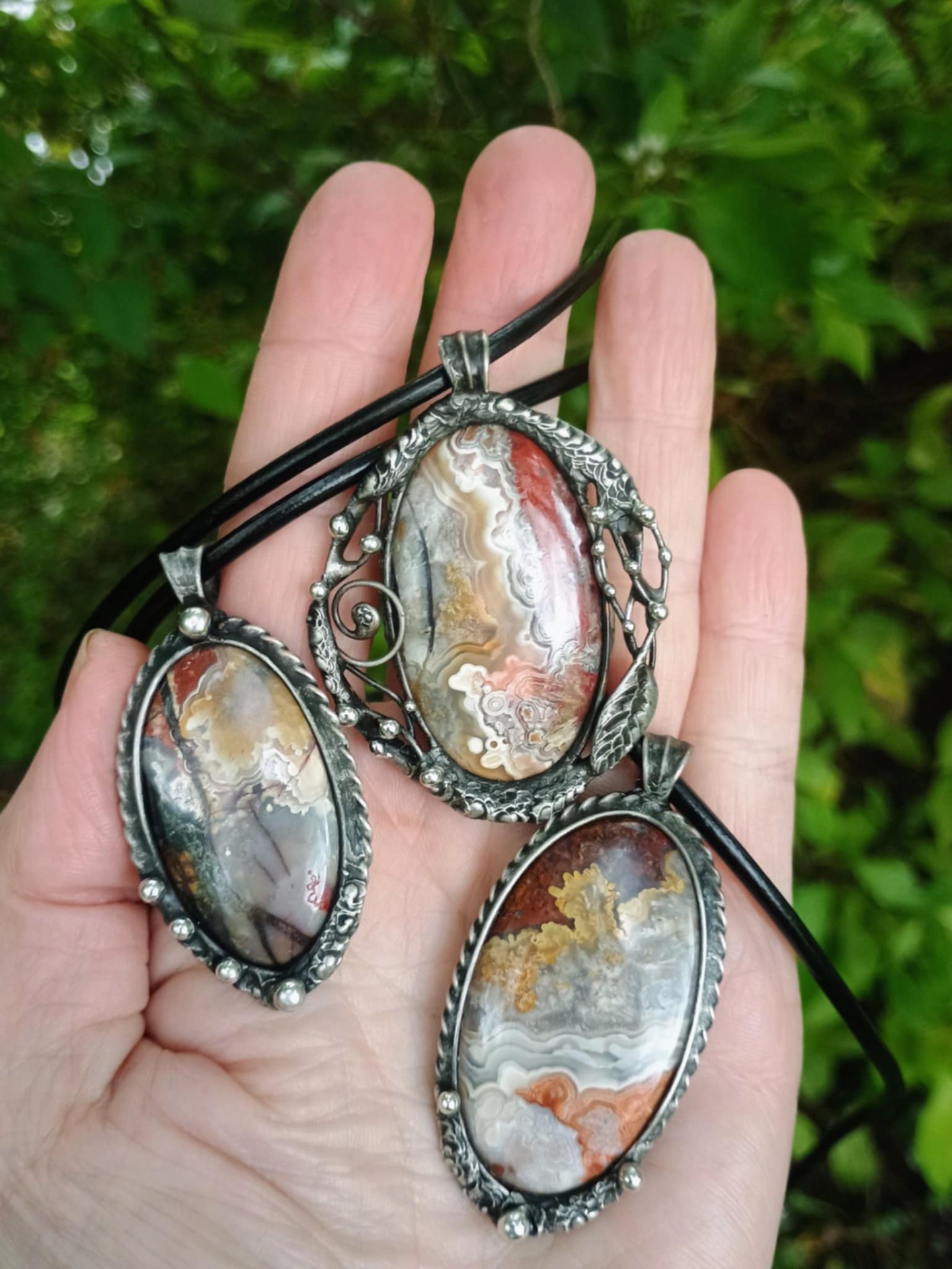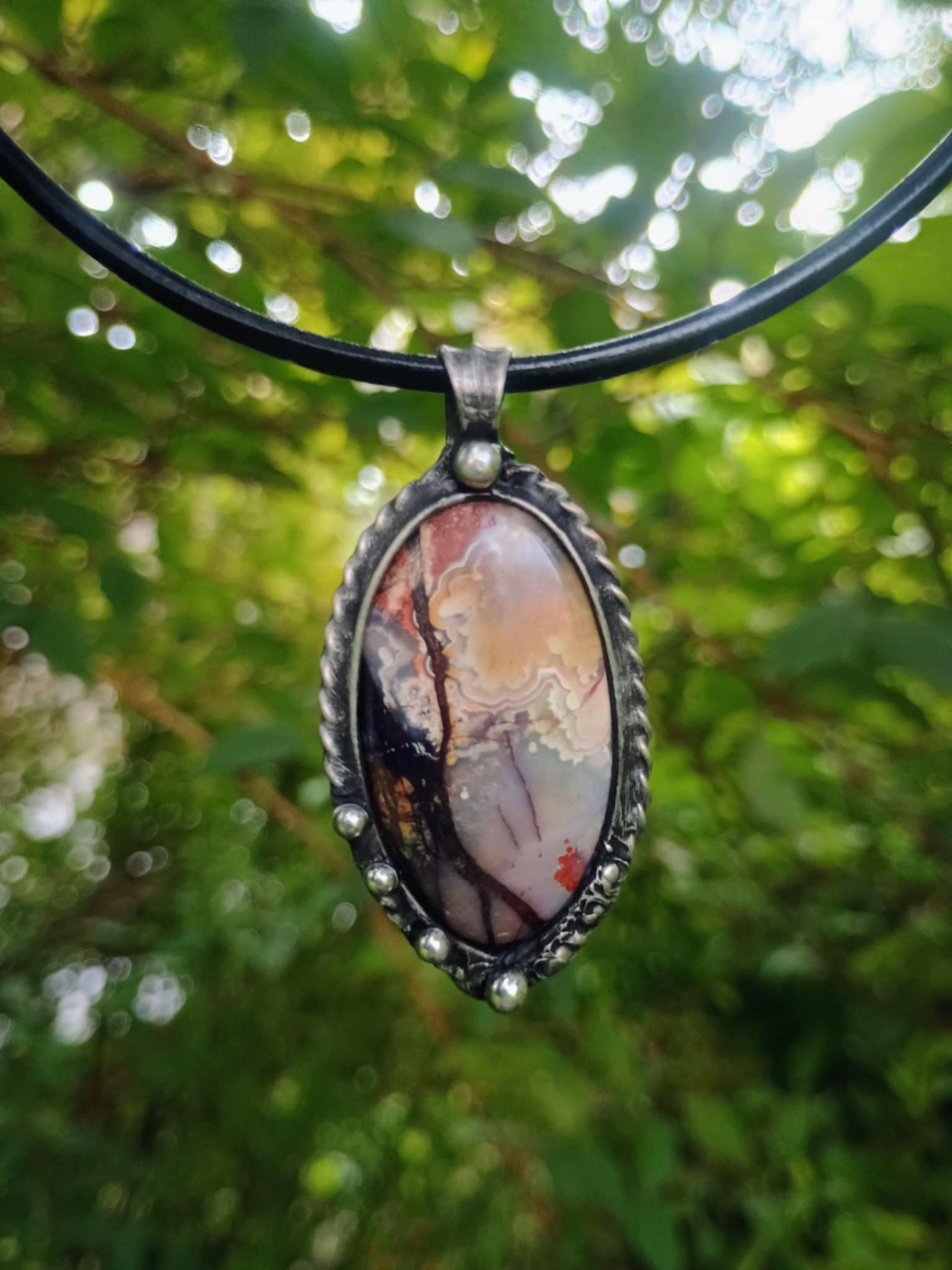 Zavěšeno na černé kůži 45 cm.