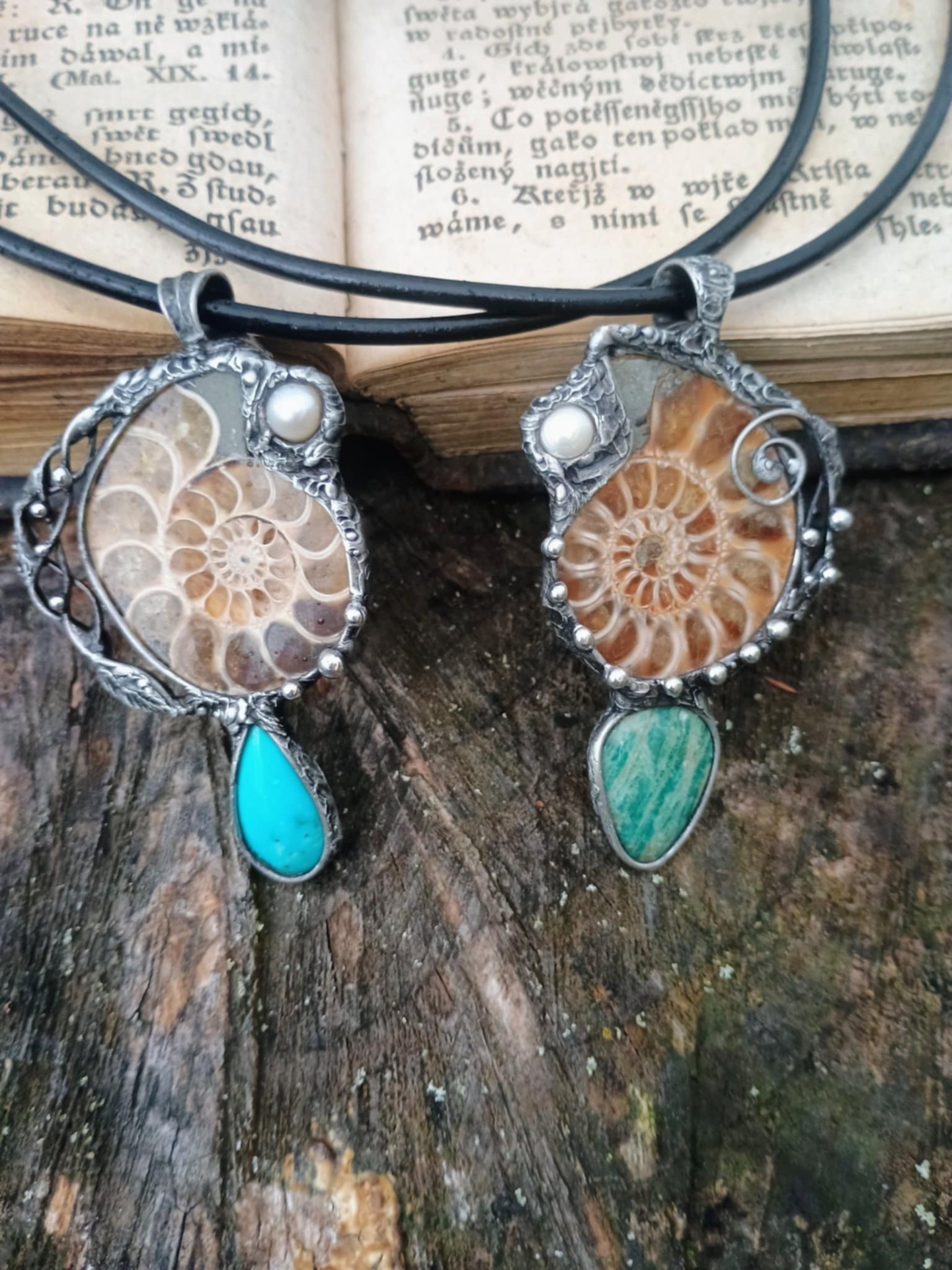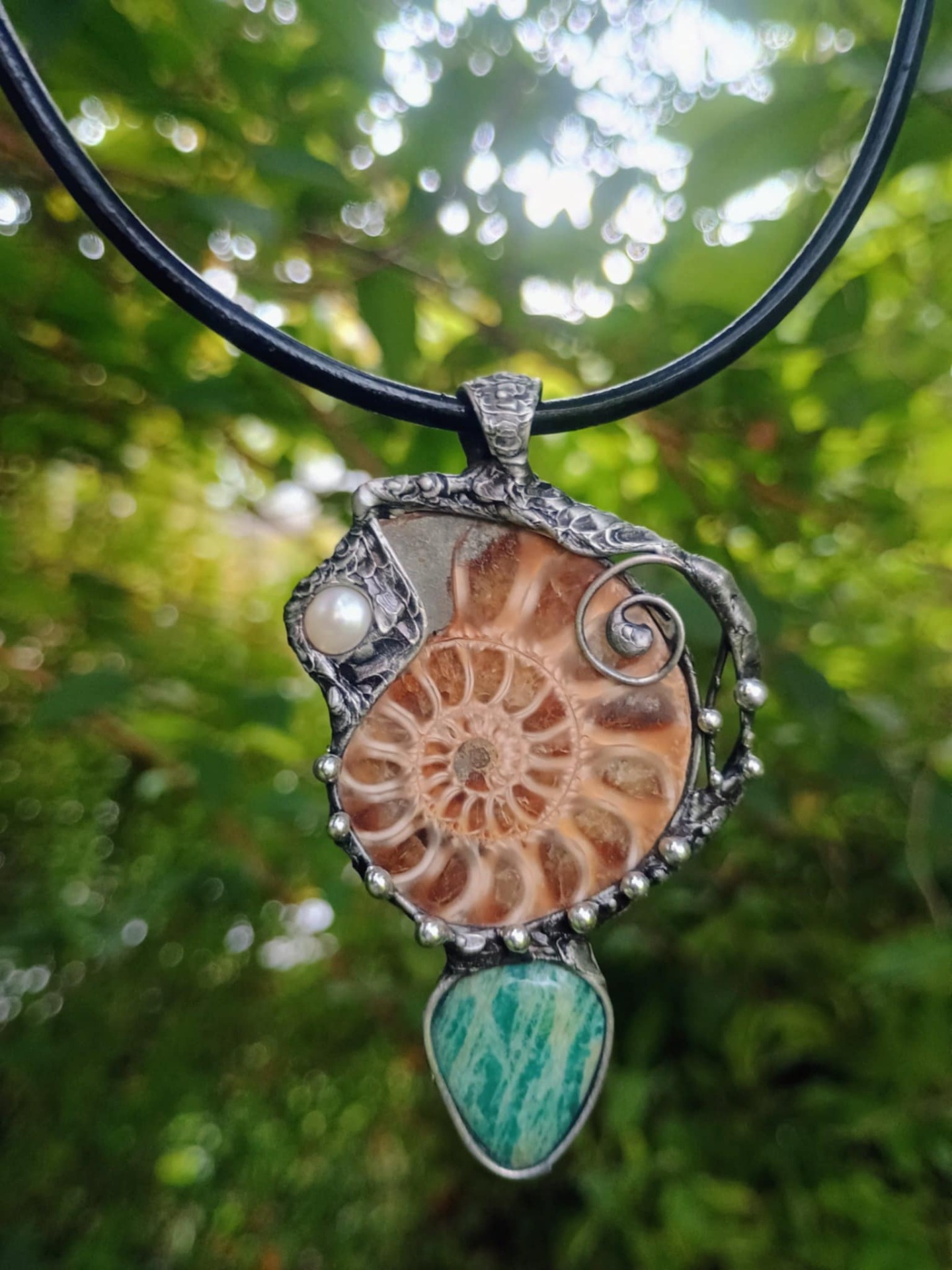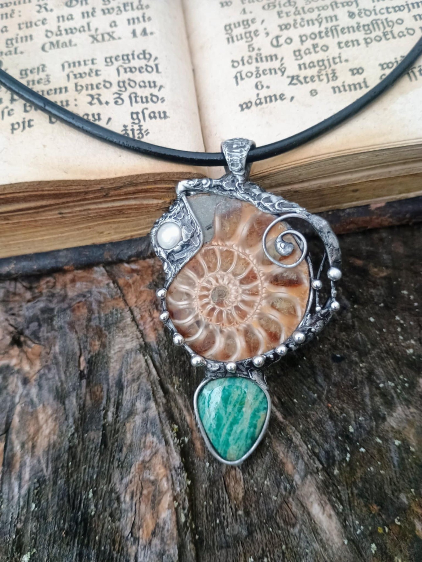 Vytvořeno z mědi, bezolovnatého cínu s příměsí stříbra, z Amonitu - fosilie, Amazonitu a říční perly.