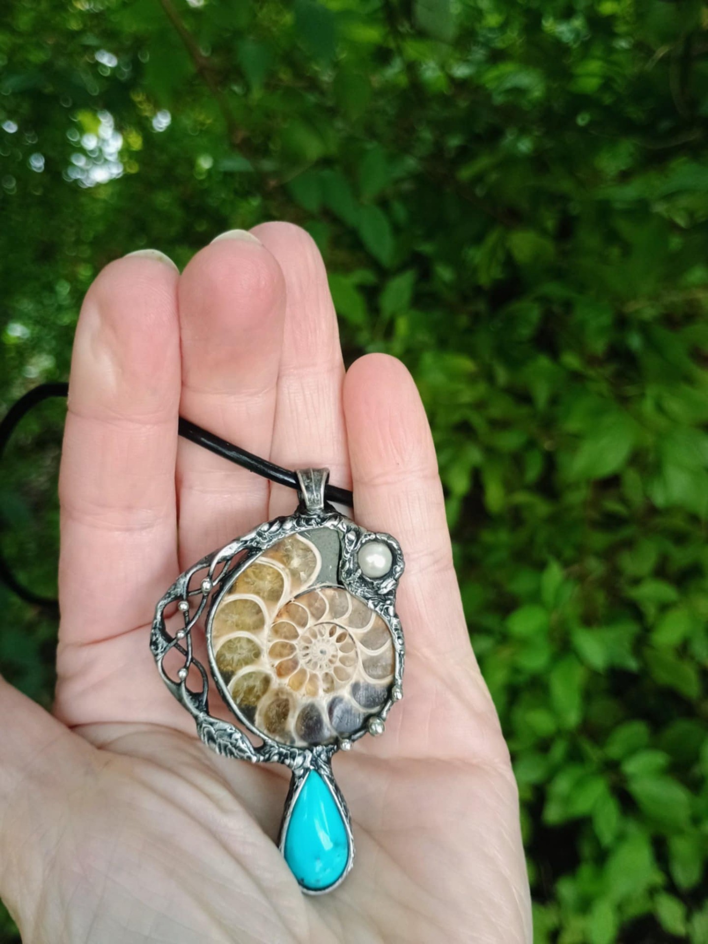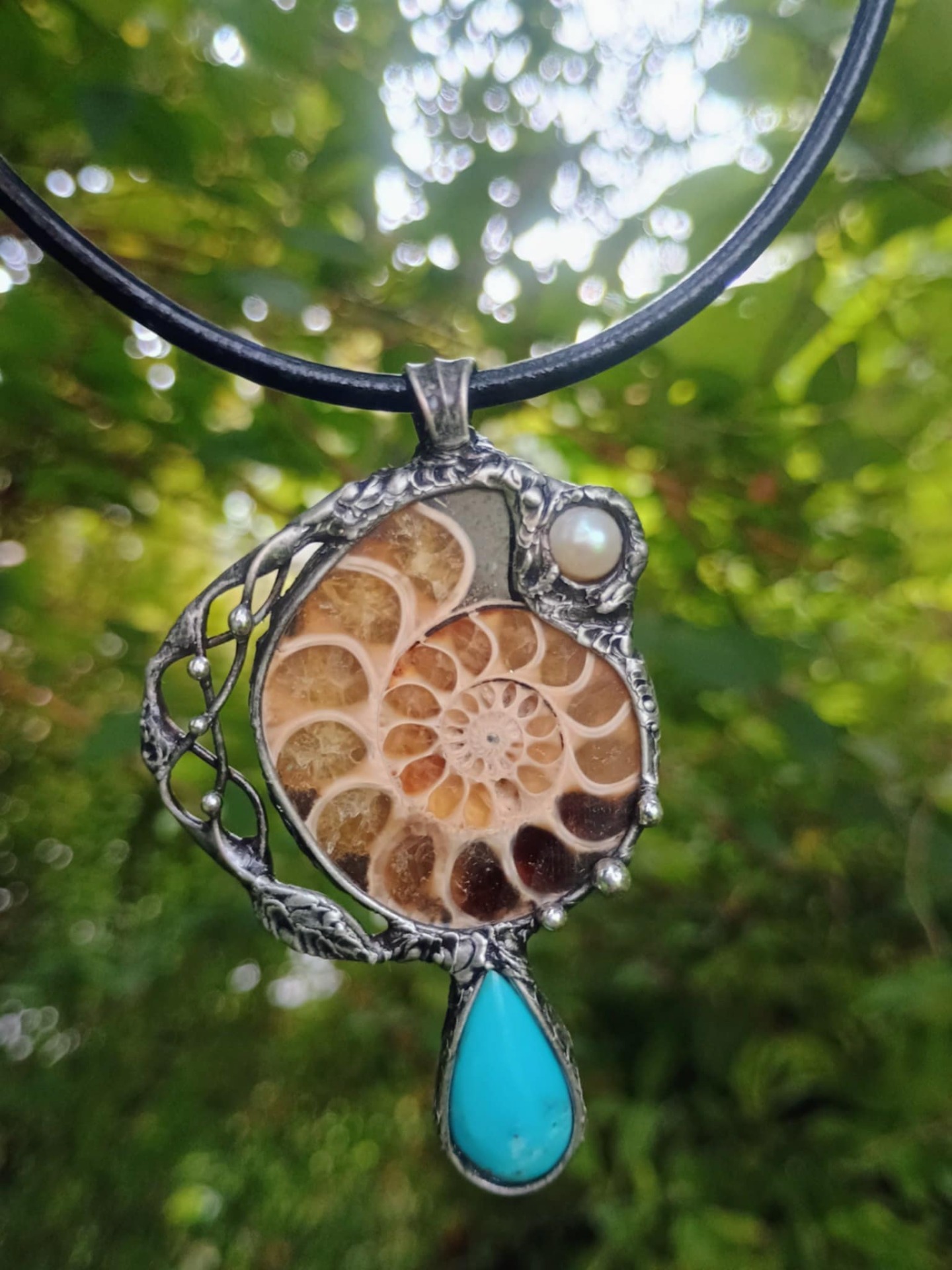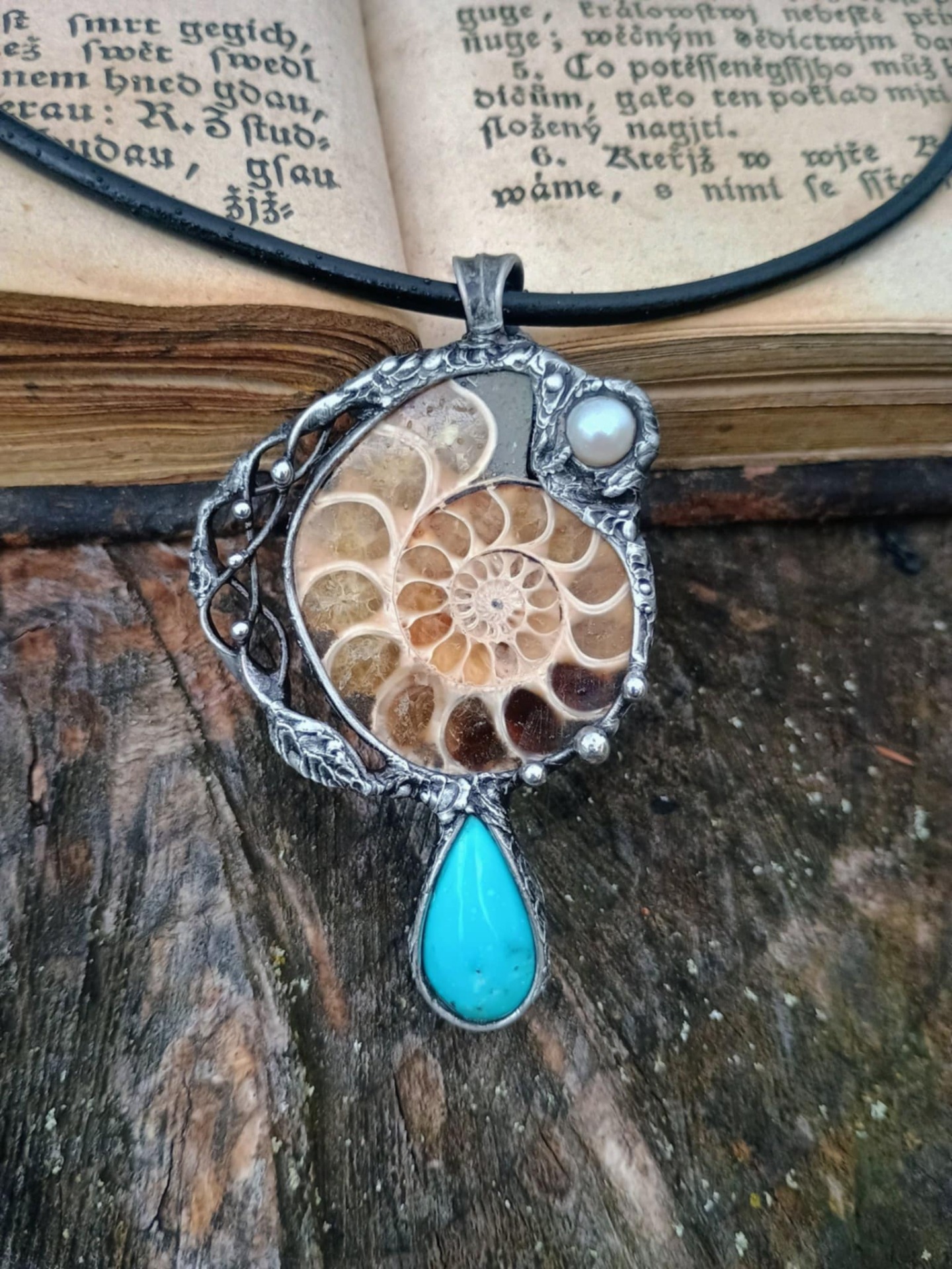 Vytvořeno z mědi, bezolovnatého cínu s příměsí stříbra, z Amonitu - fosílie, pravého tyrkysu z USA a říční perly. Velký výrazný šperk.