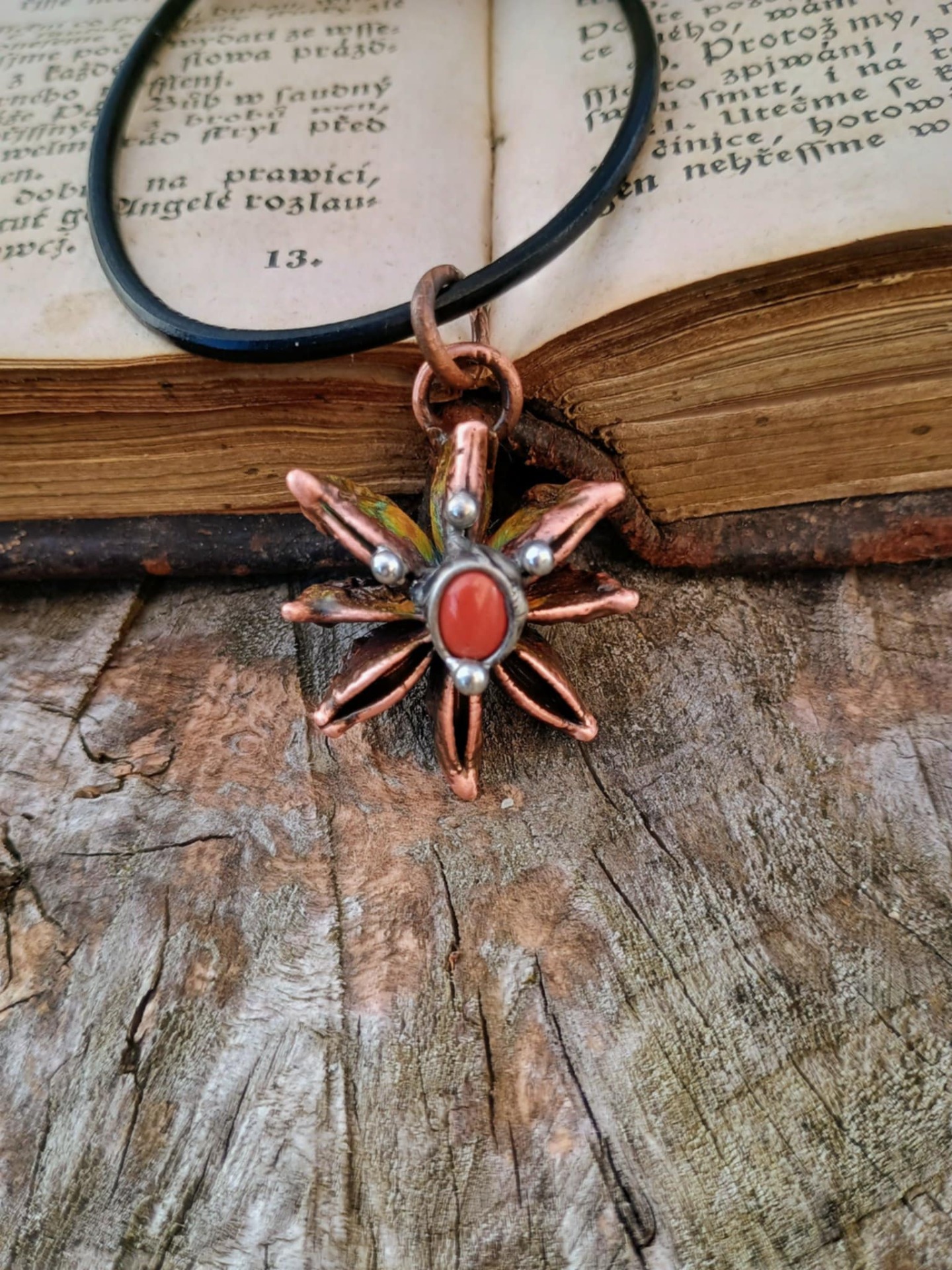 Pokovený Badián mědí. Doplněno o Karneol. Patinováno pro vytvoření starobylého vzhledu. Lakováno.
