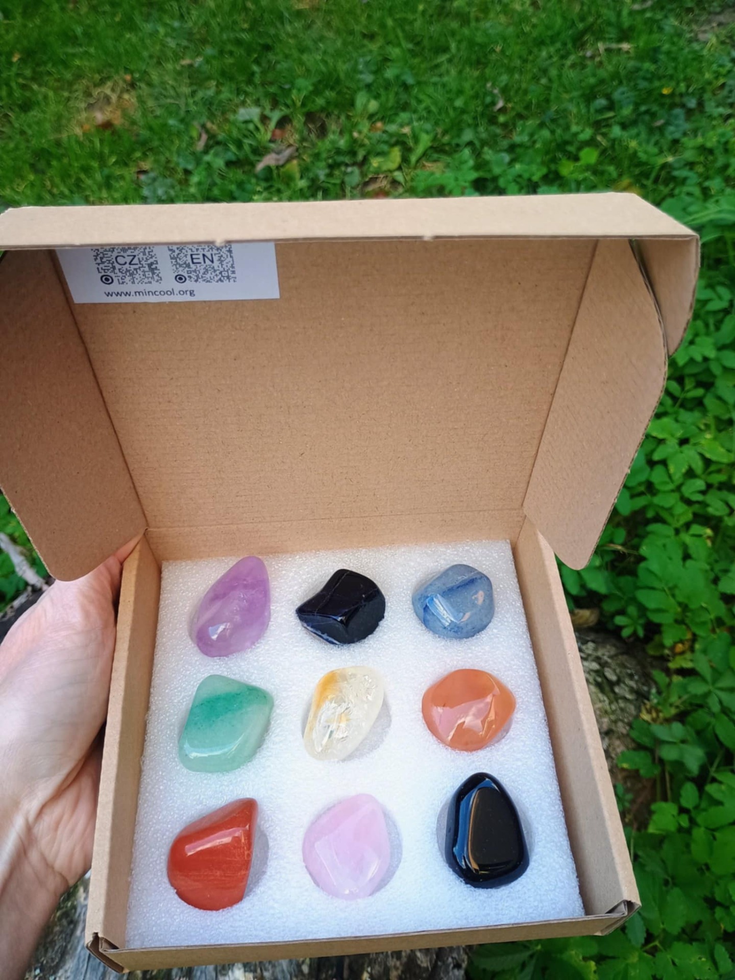 Čakrová sada 3 s informacemi o minerálech a čakrách přes QR kód.