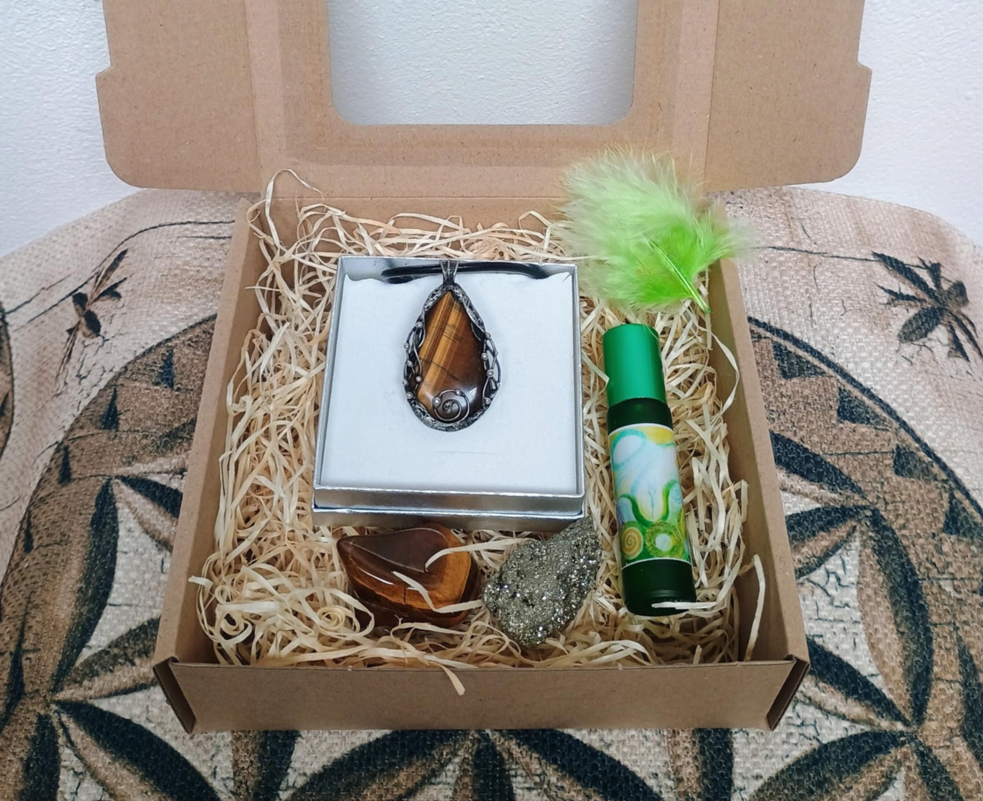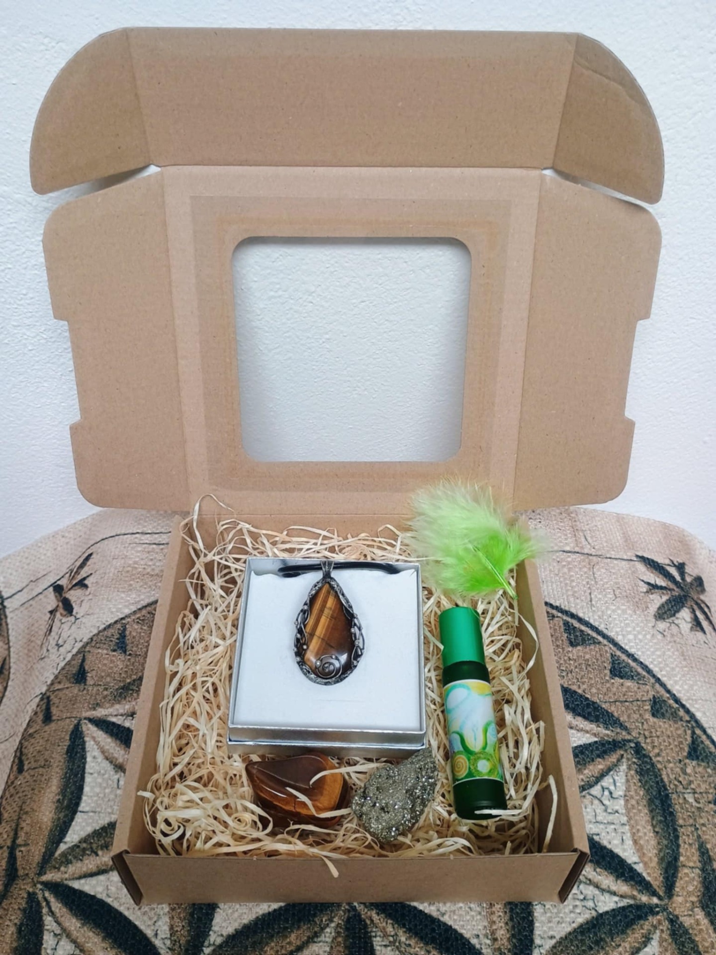 Balíček obsahuje Cínovaný šperk s názvem: Tygří oko pro rozvoj osobní síly.