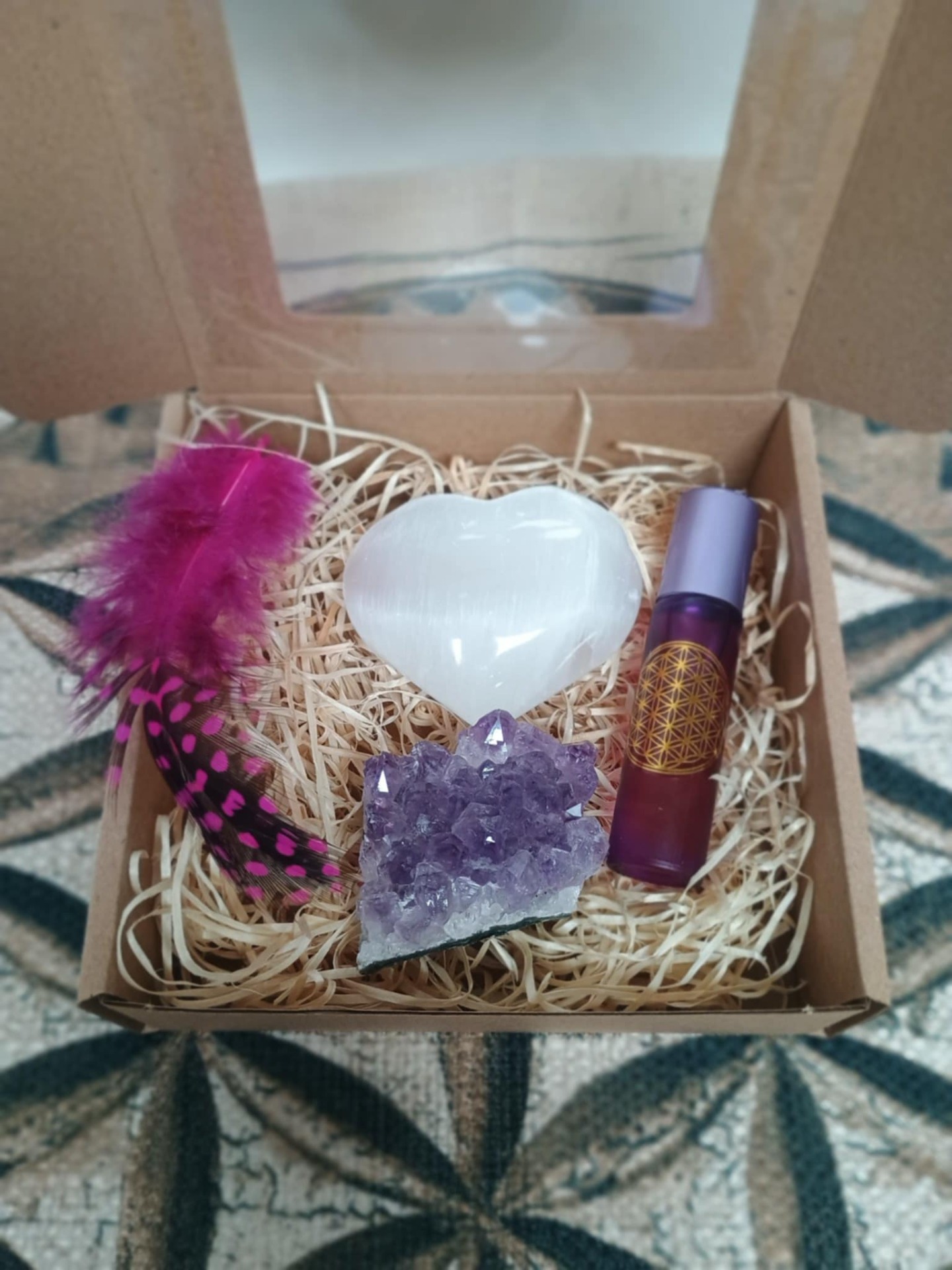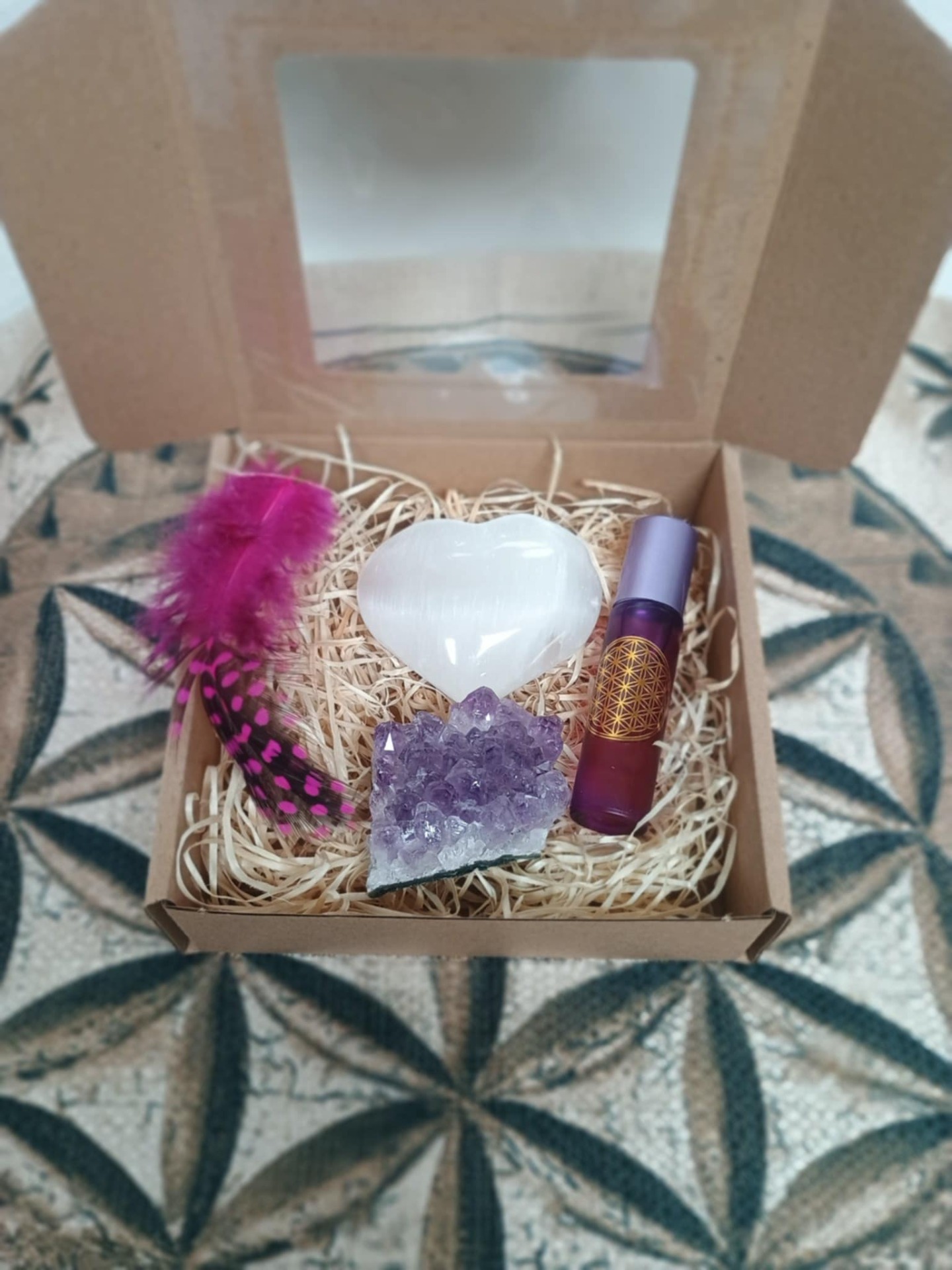 Balíček obsahuje : Velké srdce ze Selenitu a drúzu Ametystu.