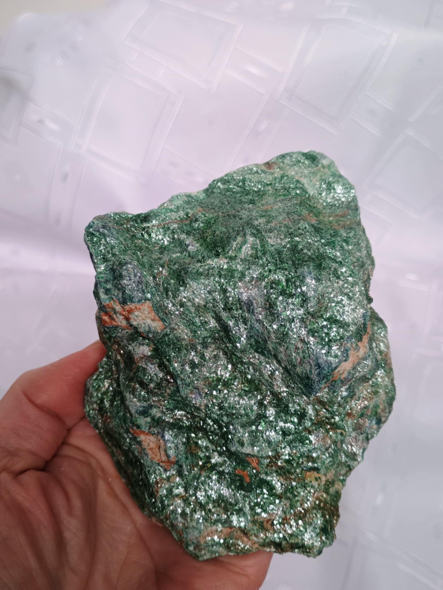 Krásný třpytivý Fuchsit. Přírodní surový minerál. Přináší klid, harmonii, harmonizuje srdeční čakru.
