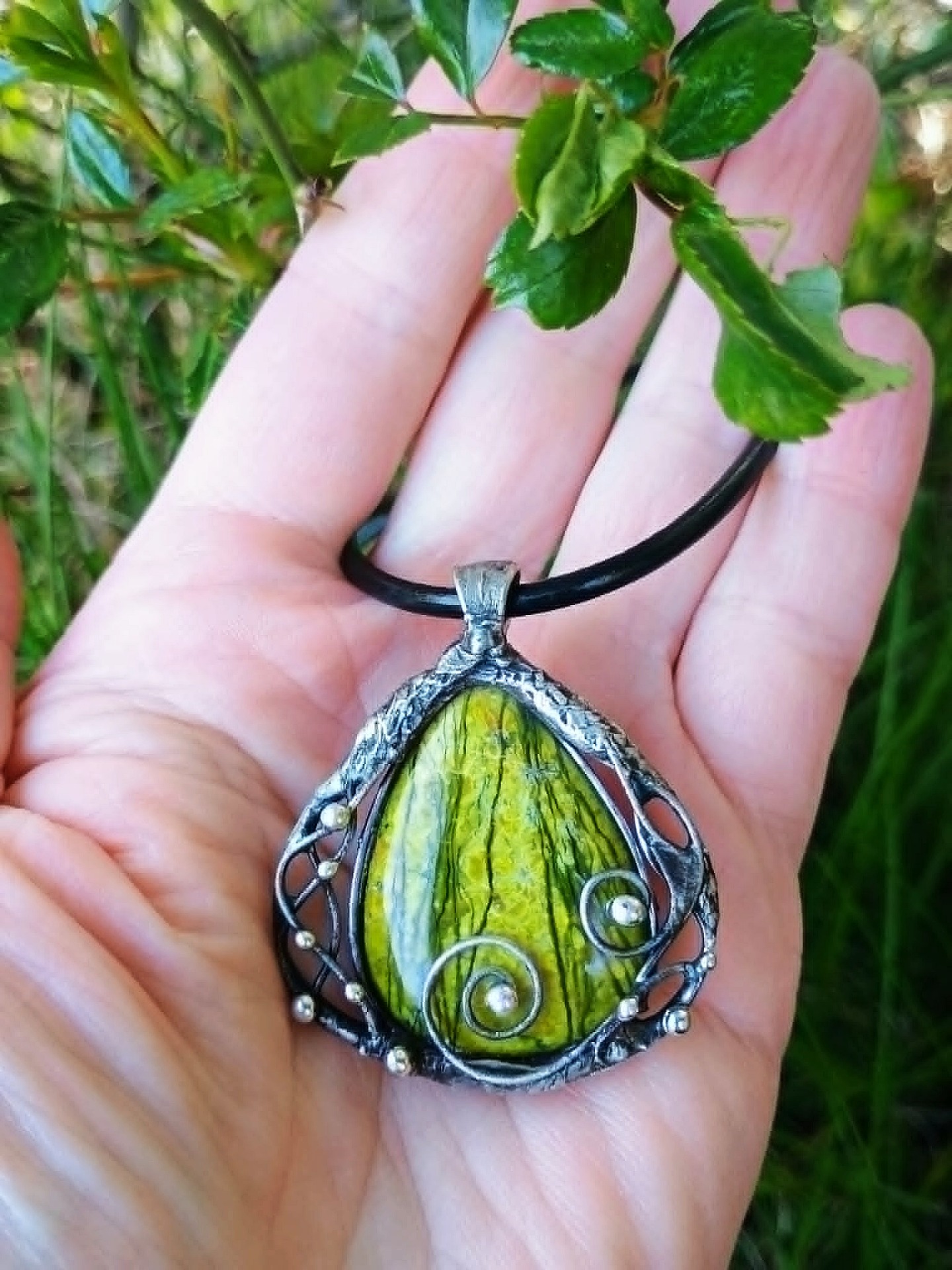 Zavěšeno na černé kůži 45 cm.
