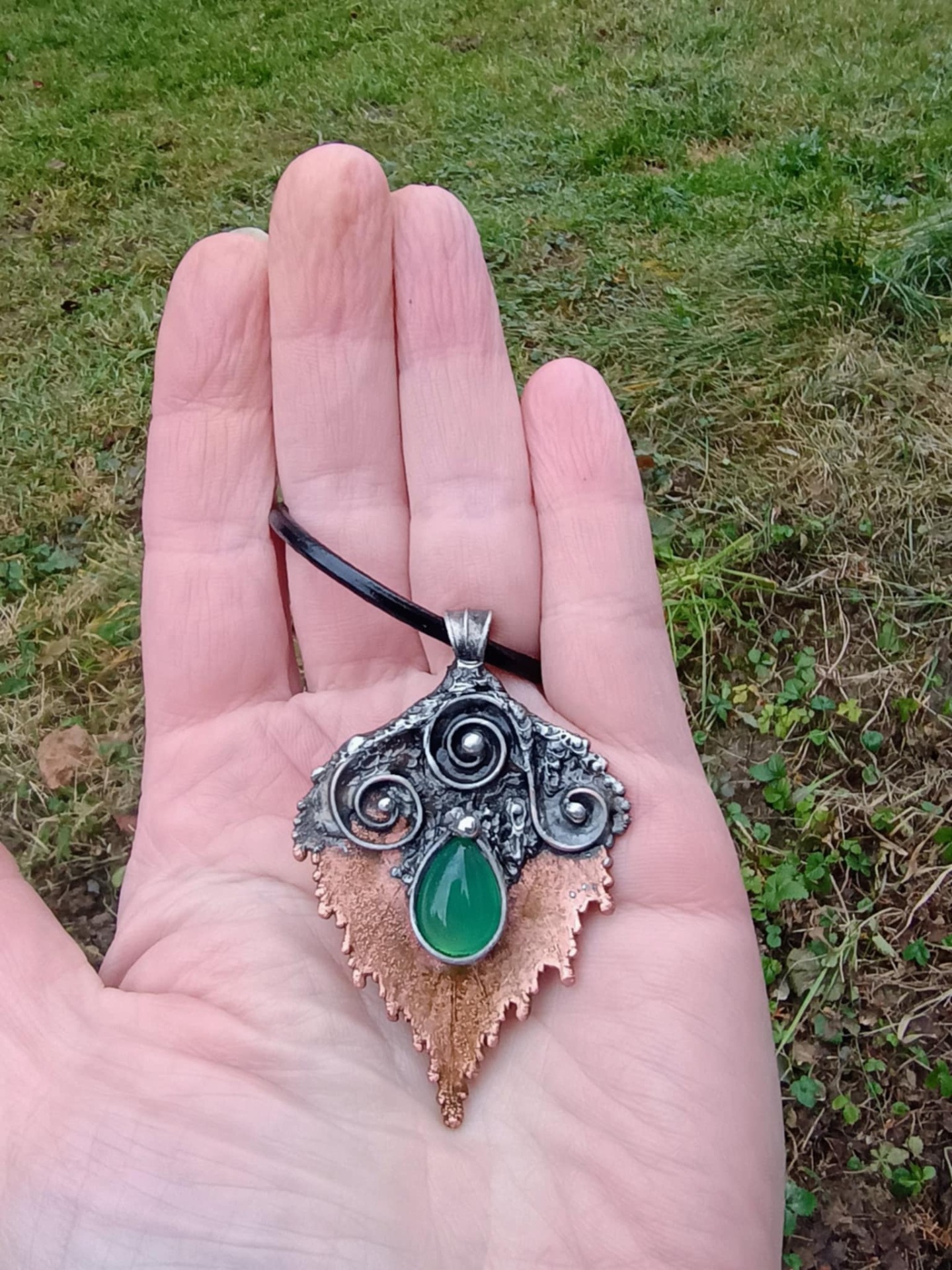 Pokovený list Břízy mědí. Doplněno o Chalcedon. Dobarvovaný.  Patinováno pro vytvoření starobylého vzhledu. Lakováno.