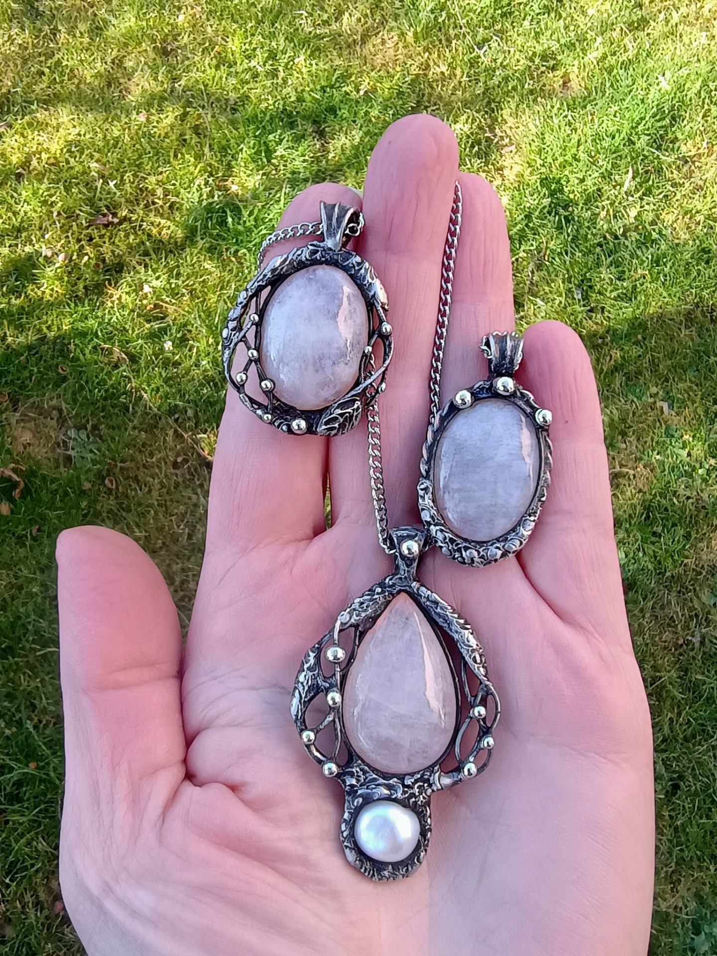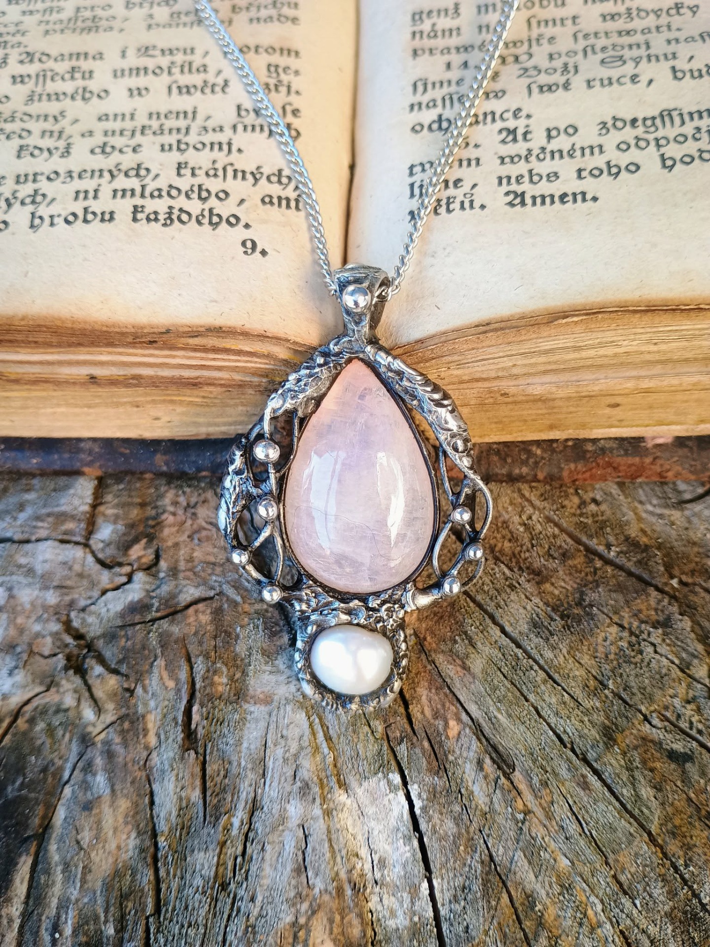Vytvořeno z mědi, bezolovnatého cínu s příměsí stříbra a z Duhového měsíčního kamene a říční perly..