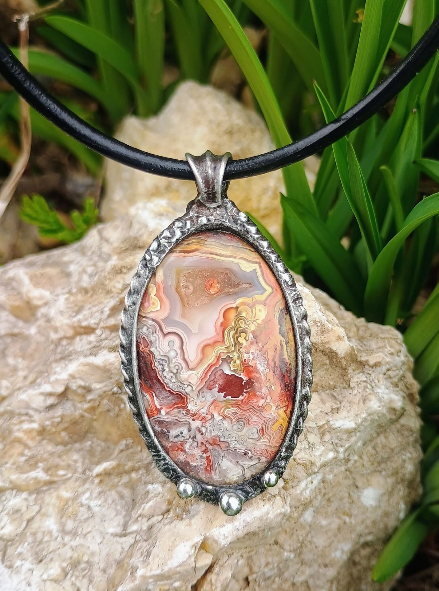Zavěšeno na tmavé černé kůži 45 cm. Patinováno.