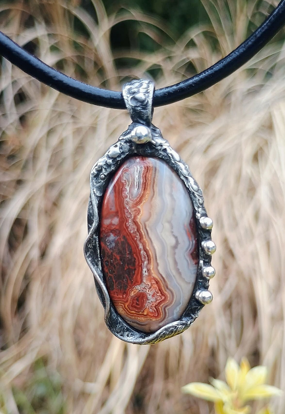 Zavěšeno na tmavé černé kůži 45 cm. Patinováno.