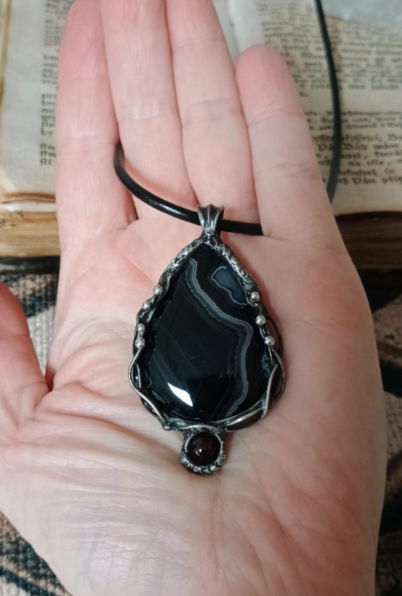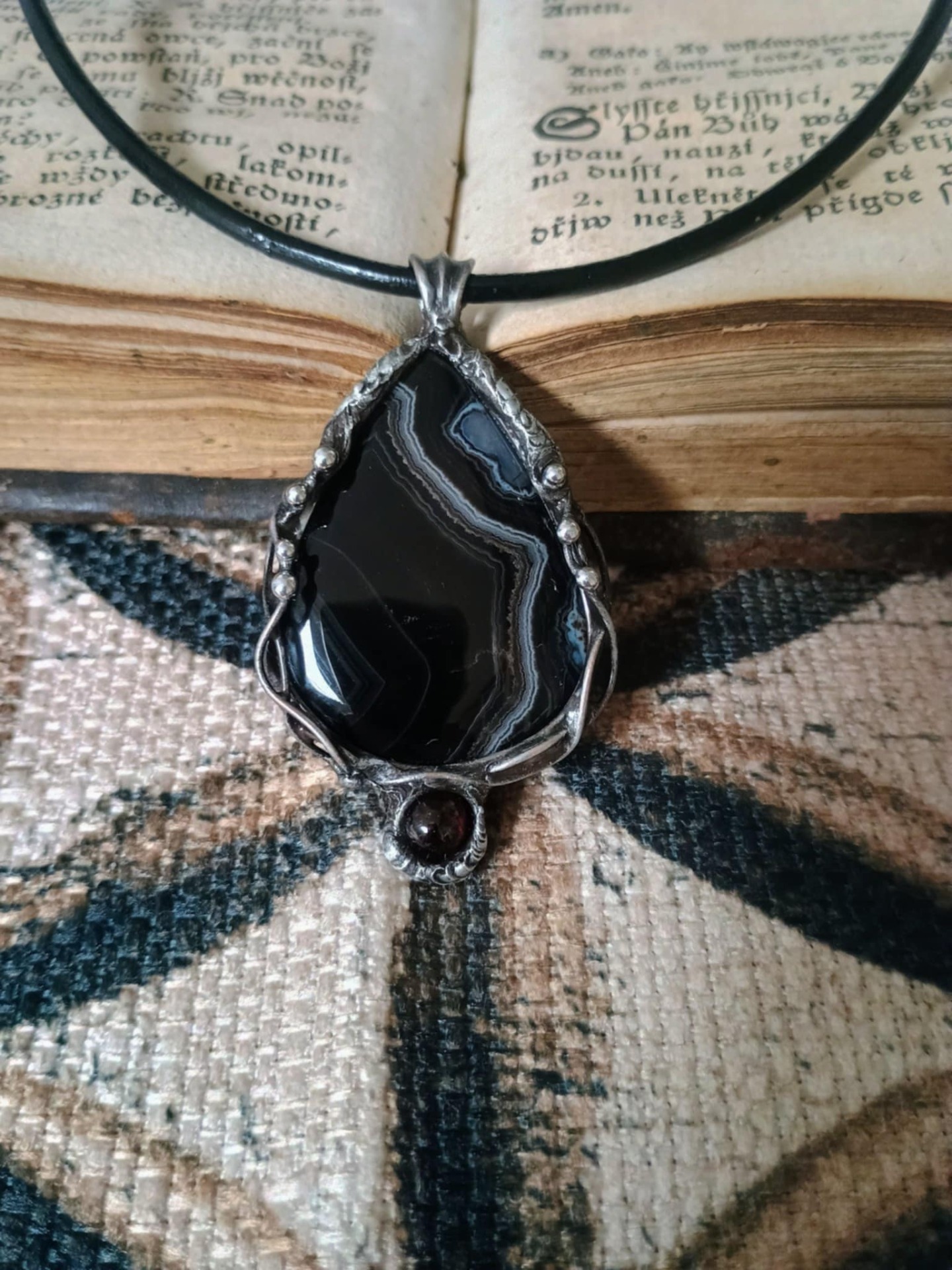 Zavěšeno na černé kůži 45 cm.