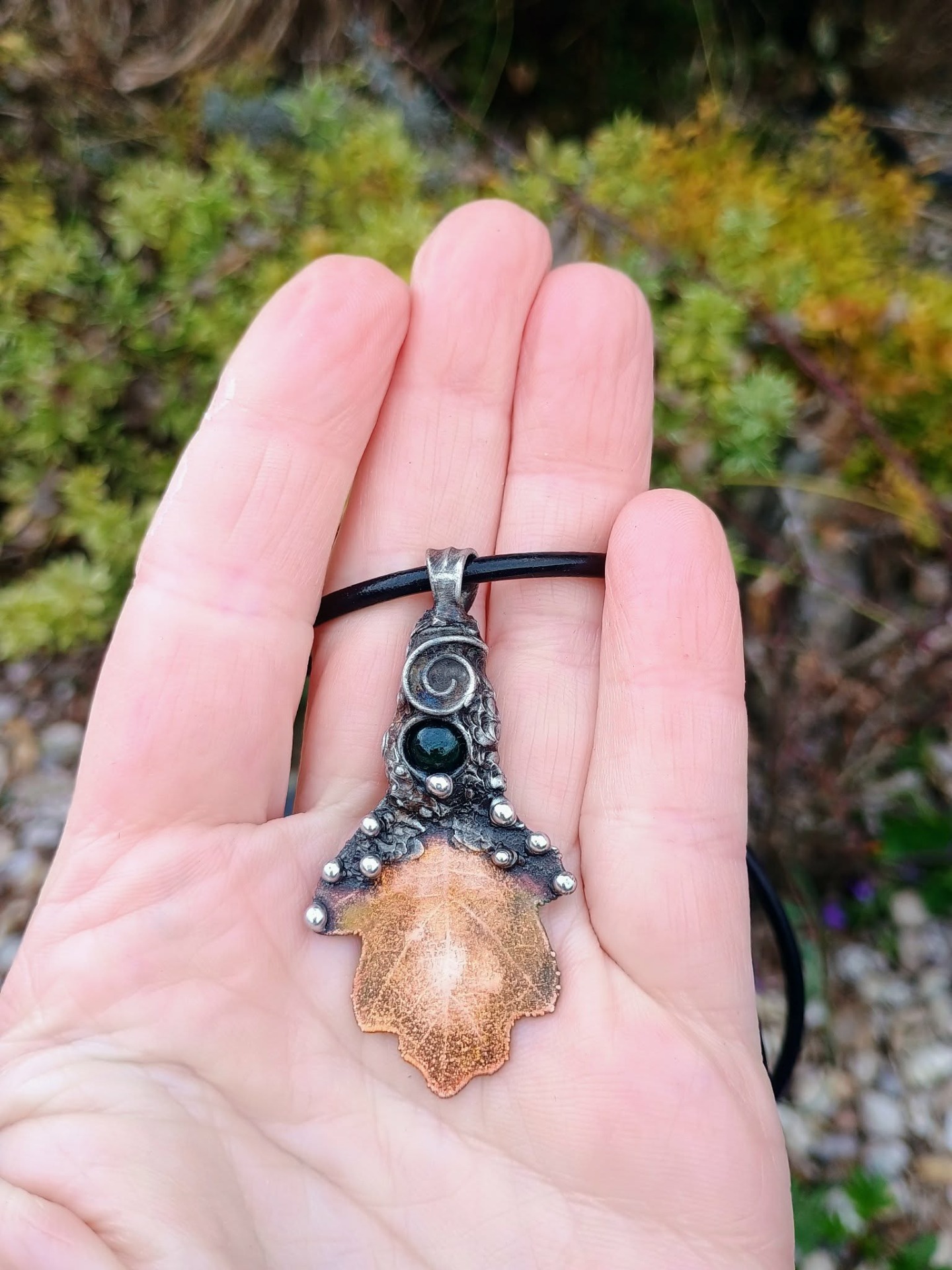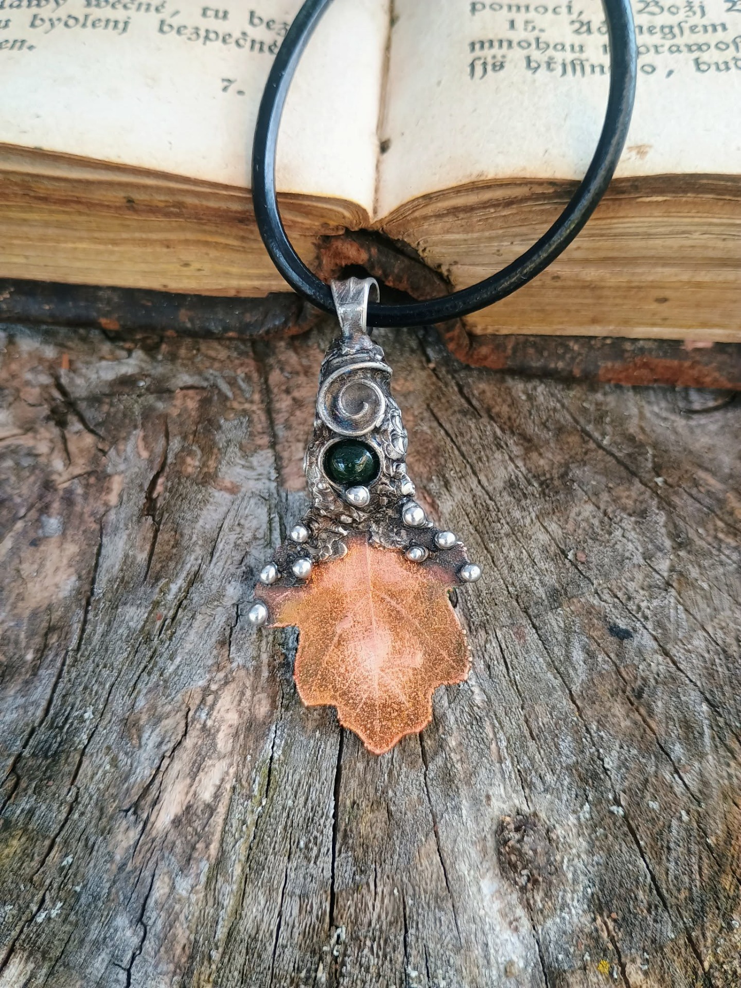 Pokovený list Dubu mědí. Doplněno o Smaragdový Avanturín. Patinováno pro vytvoření starobylého vzhledu. Lakováno.