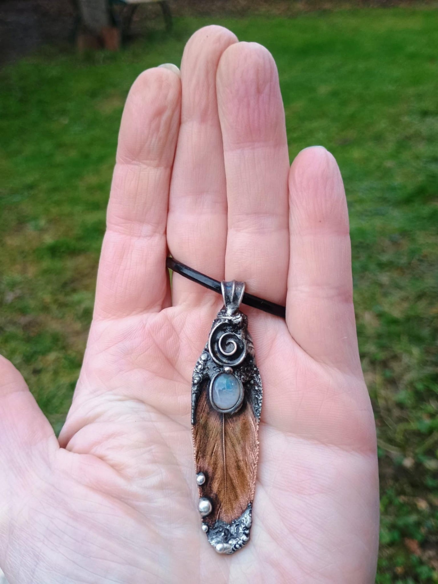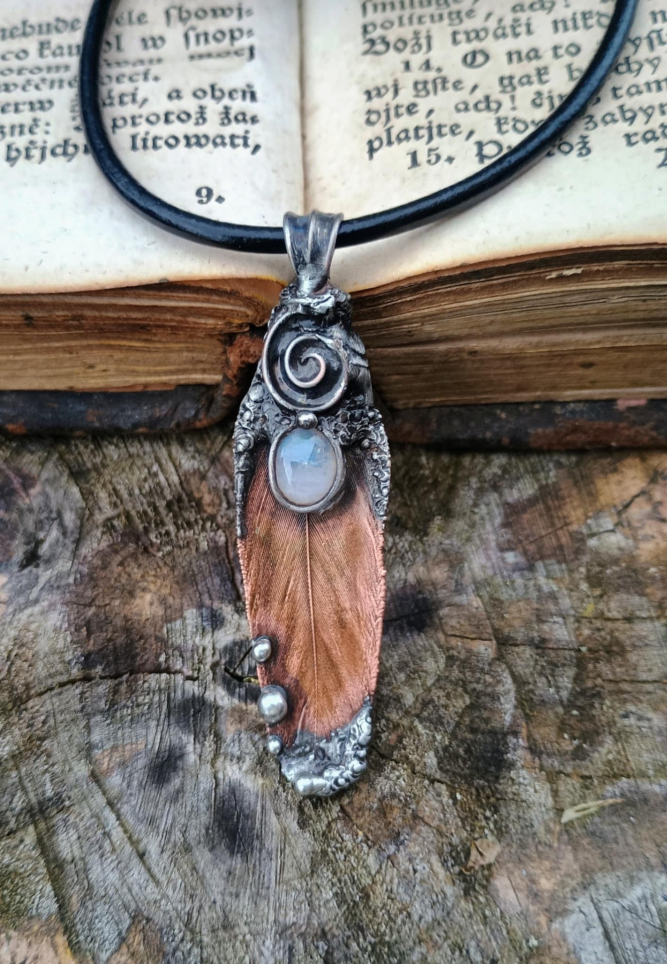 Pokovené peříčko mědí. Doplněno o Duhový měsíční kámen. Patinováno pro vytvoření starobylého vzhledu. Lakováno.