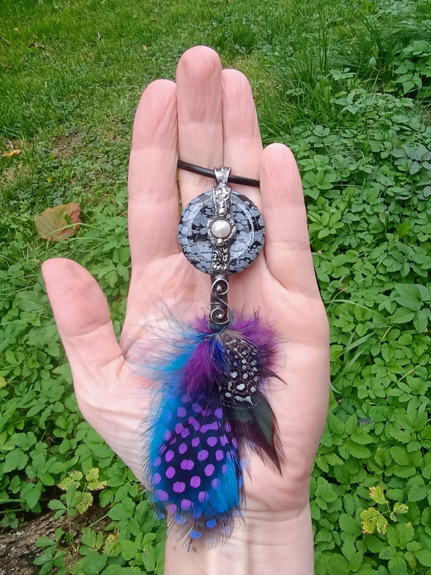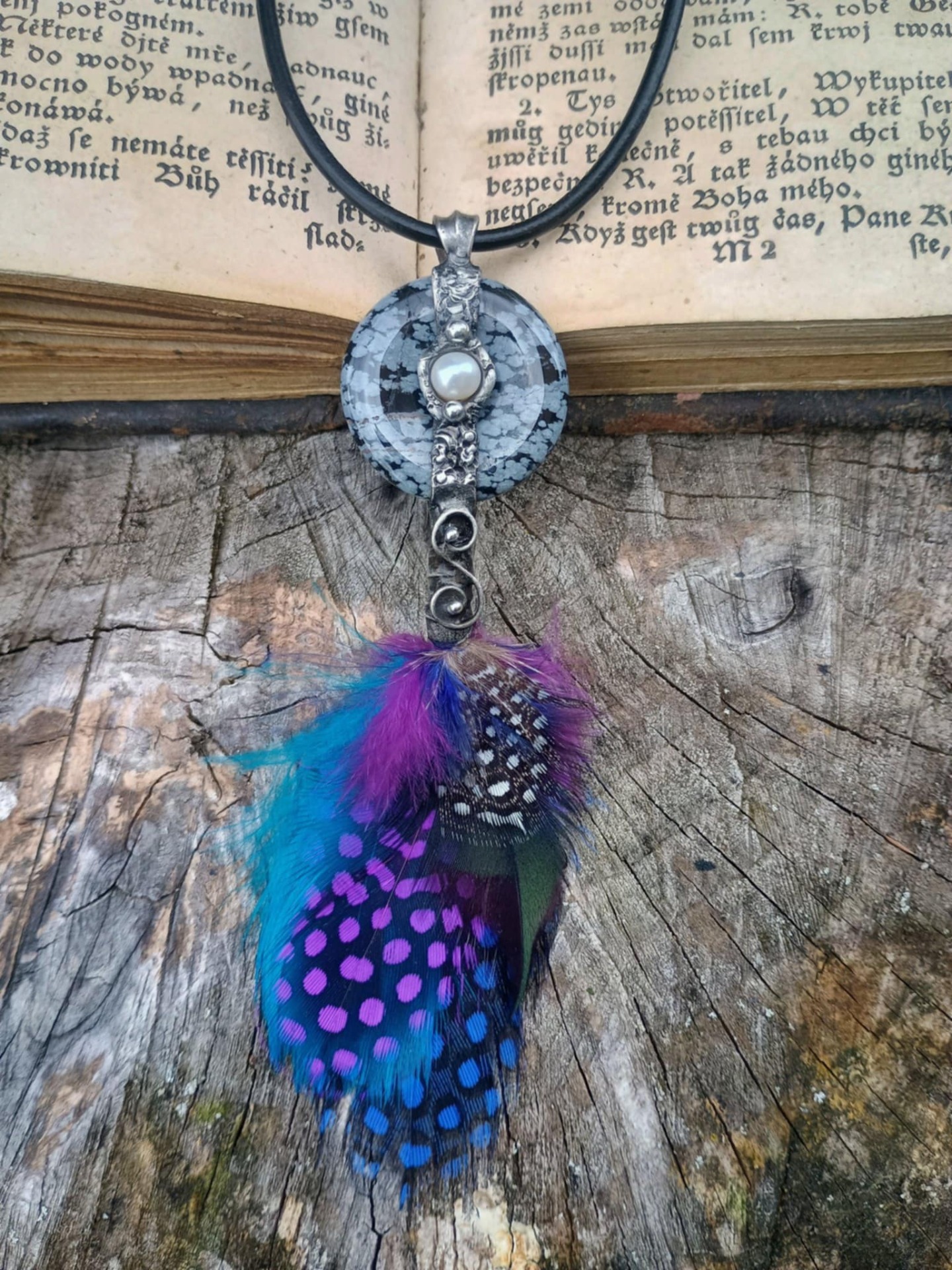 Vytvořeno z mědi, bezolovnatého cínu s příměsí stříbra, z Amonitu - fosílie, pravého tyrkysu z USA a říční perly. Velký výrazný šperk.