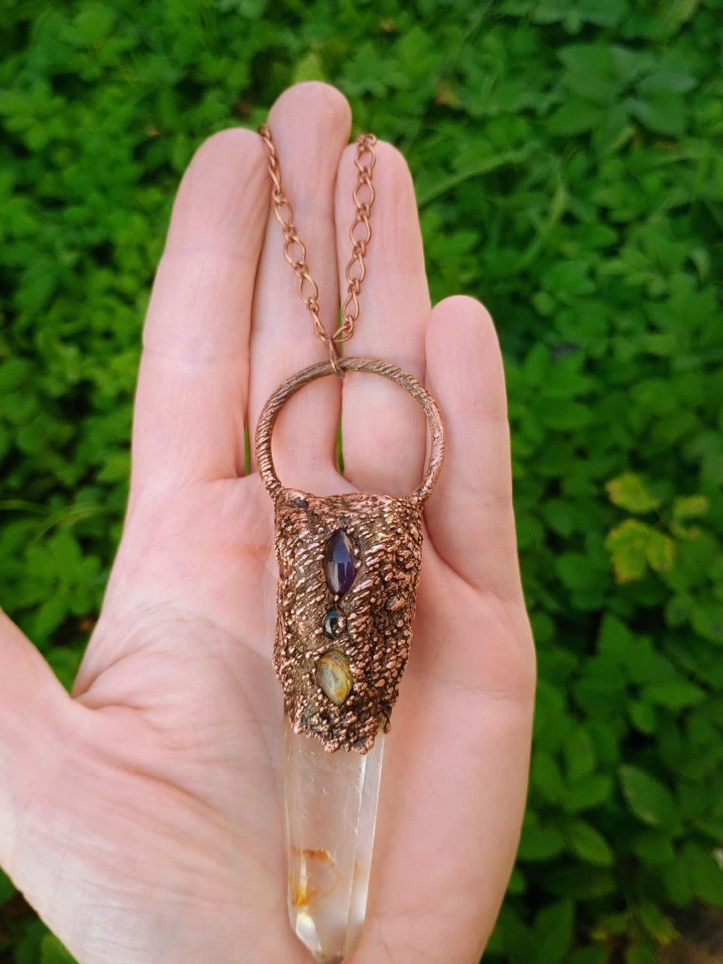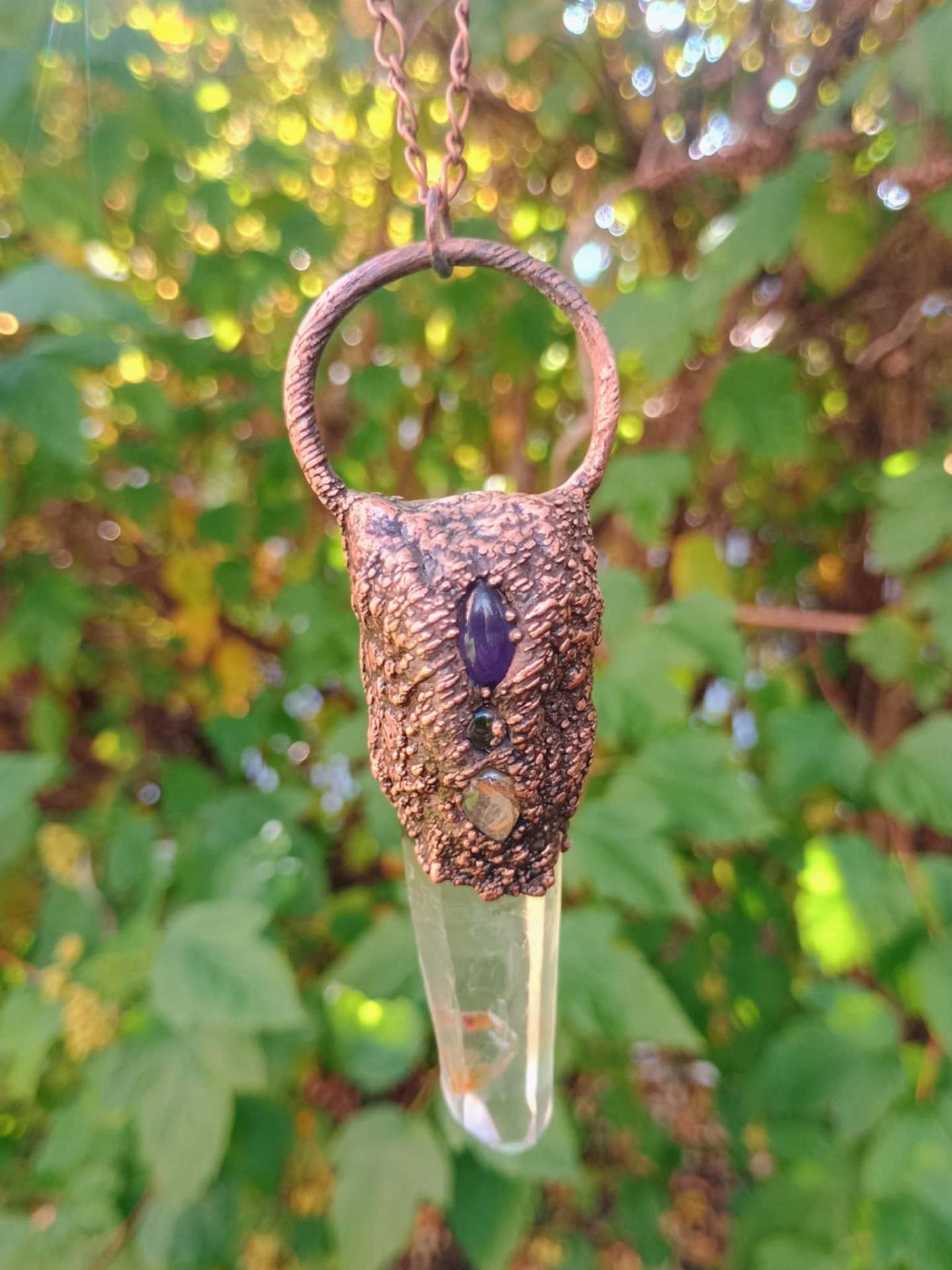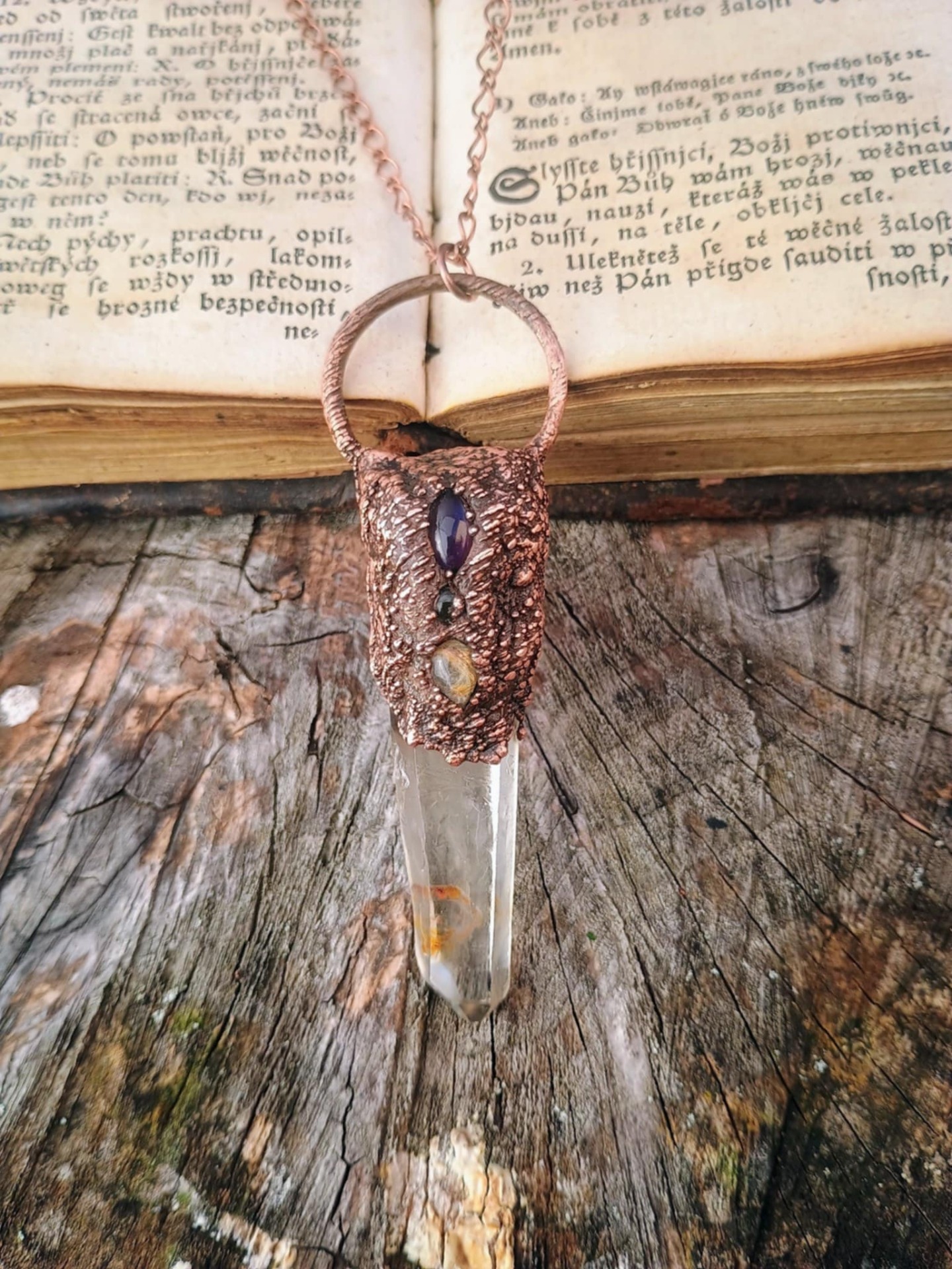 Šperk vytvořený z Křišťálu, Ametystu, Smaragdu a Sagenitu. Pokoveno mědí. Velký výrazný, těžký šperk nebo zářič do prostoru.