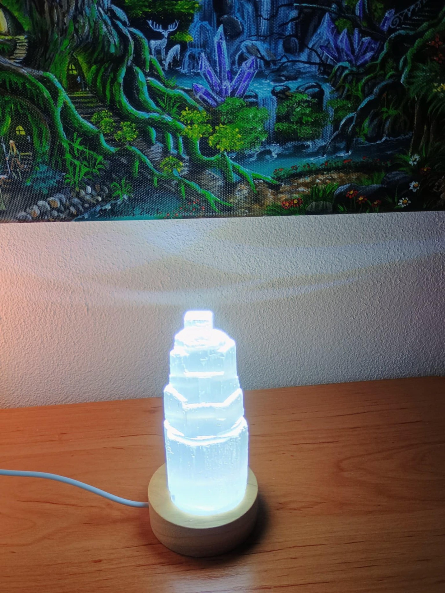 Lampa je dodávána včetně světýlka, na které si můžete položit i jiný krystal. Koncovka na USB. Zapínání a vypínání na vypínač jako lampička. Lze připojit koncovku z nabíječky a dát i do elektrické zásuvky. Krásné propojení světla a minerálu pro zimní večery. Ostré ledové světlo.