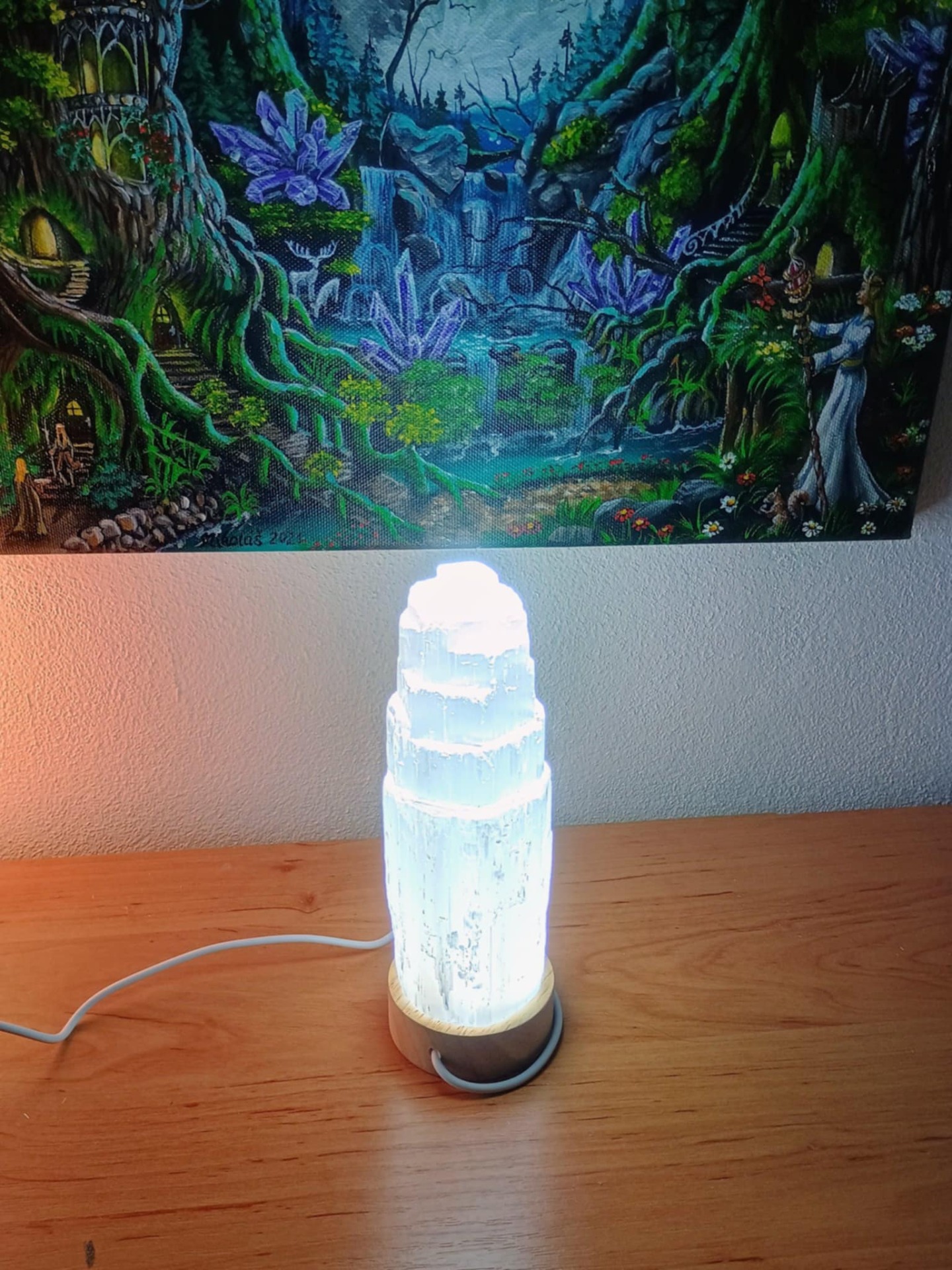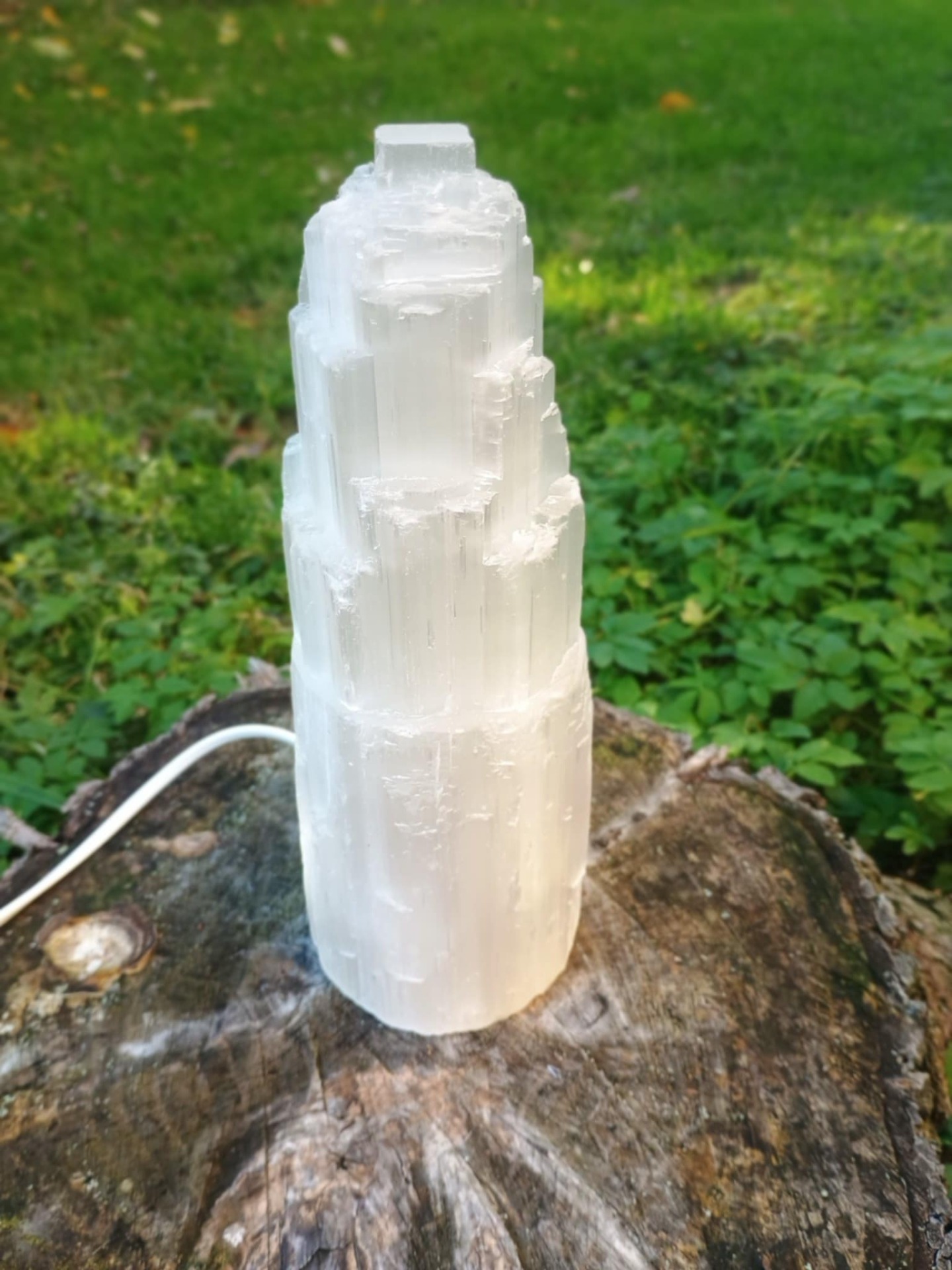 O produktu: Lampa ze surového Selenitu ve tvaru věže. Je 15 cm.