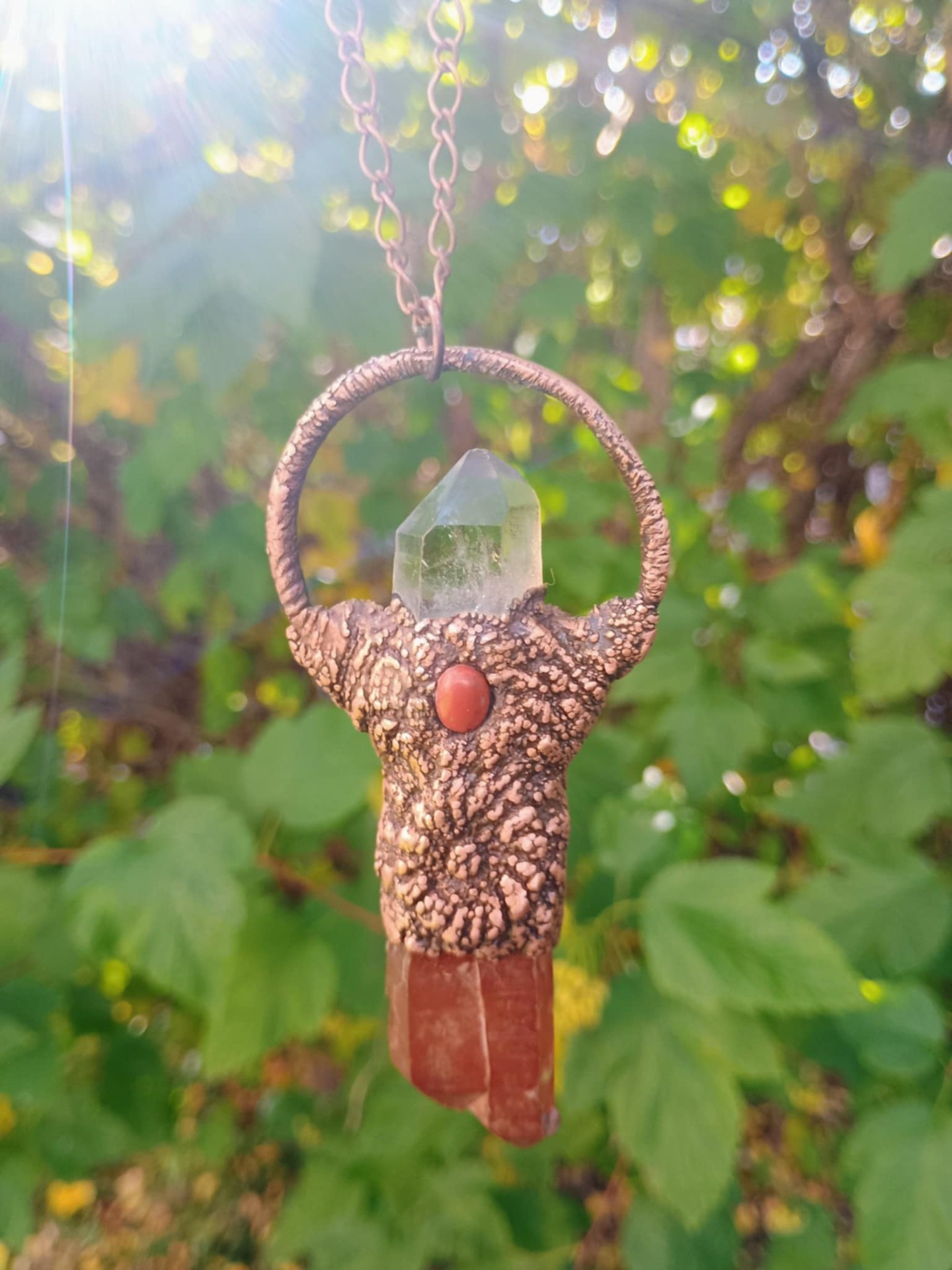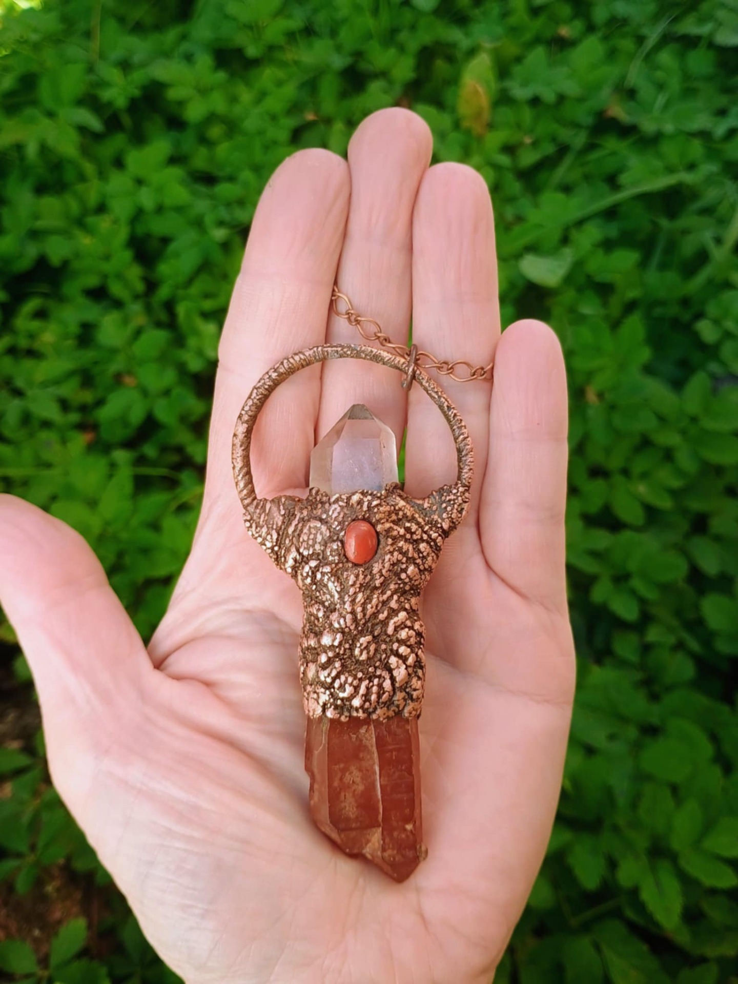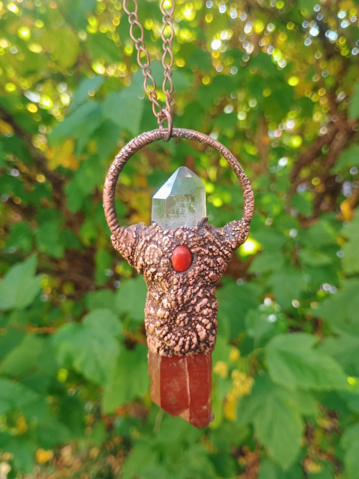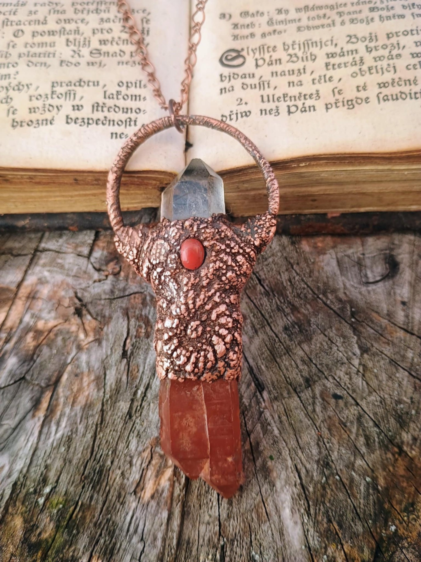 Šperk vytvořený z Křišťálu, Červeného jaspisu a Tangerine Křišťálu. Pokoveno mědí. Velký výrazný, těžký šperk nebo zářič do prostoru.