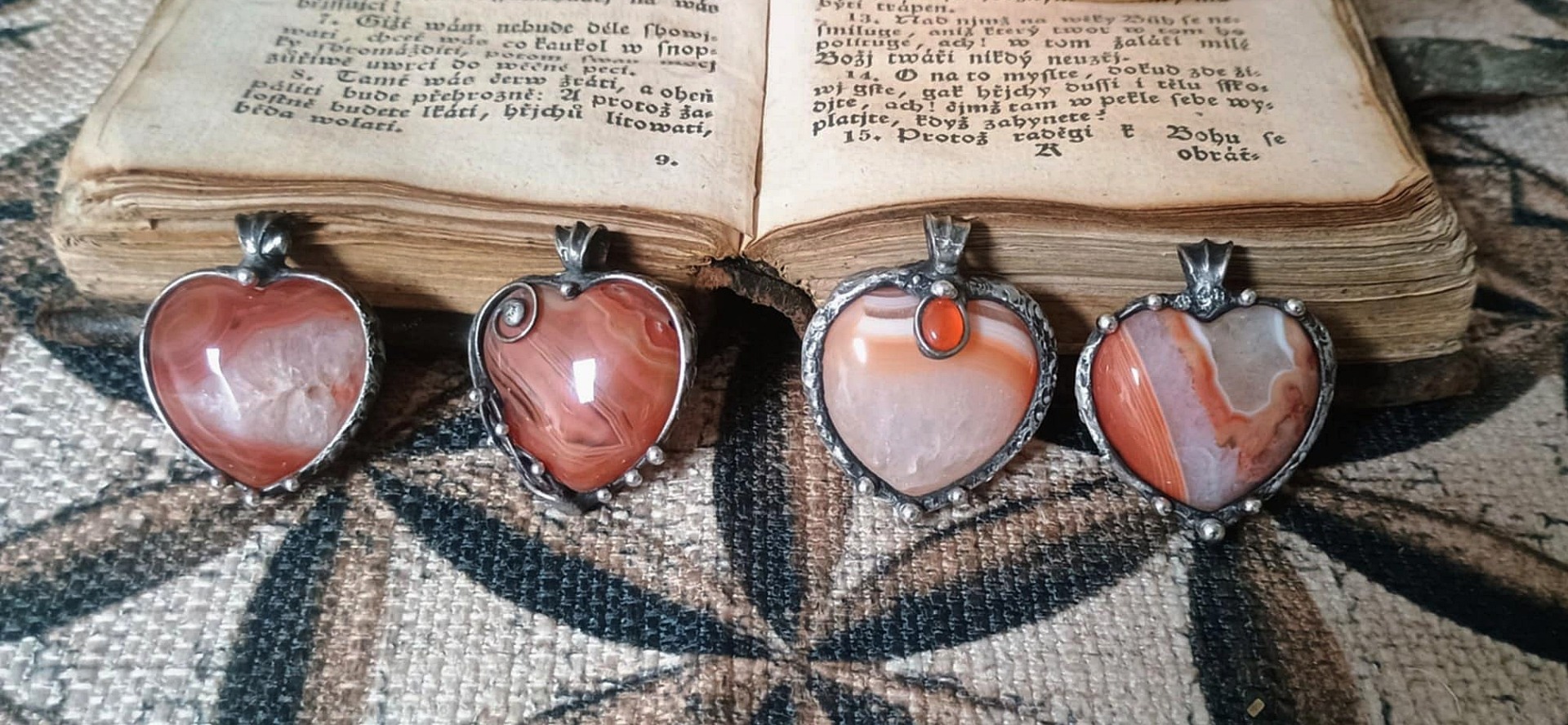 Vytvořeno z mědi, bezolovnatého cínu s příměsí stříbra a z krásného Achátu ve tvaru srdce.
