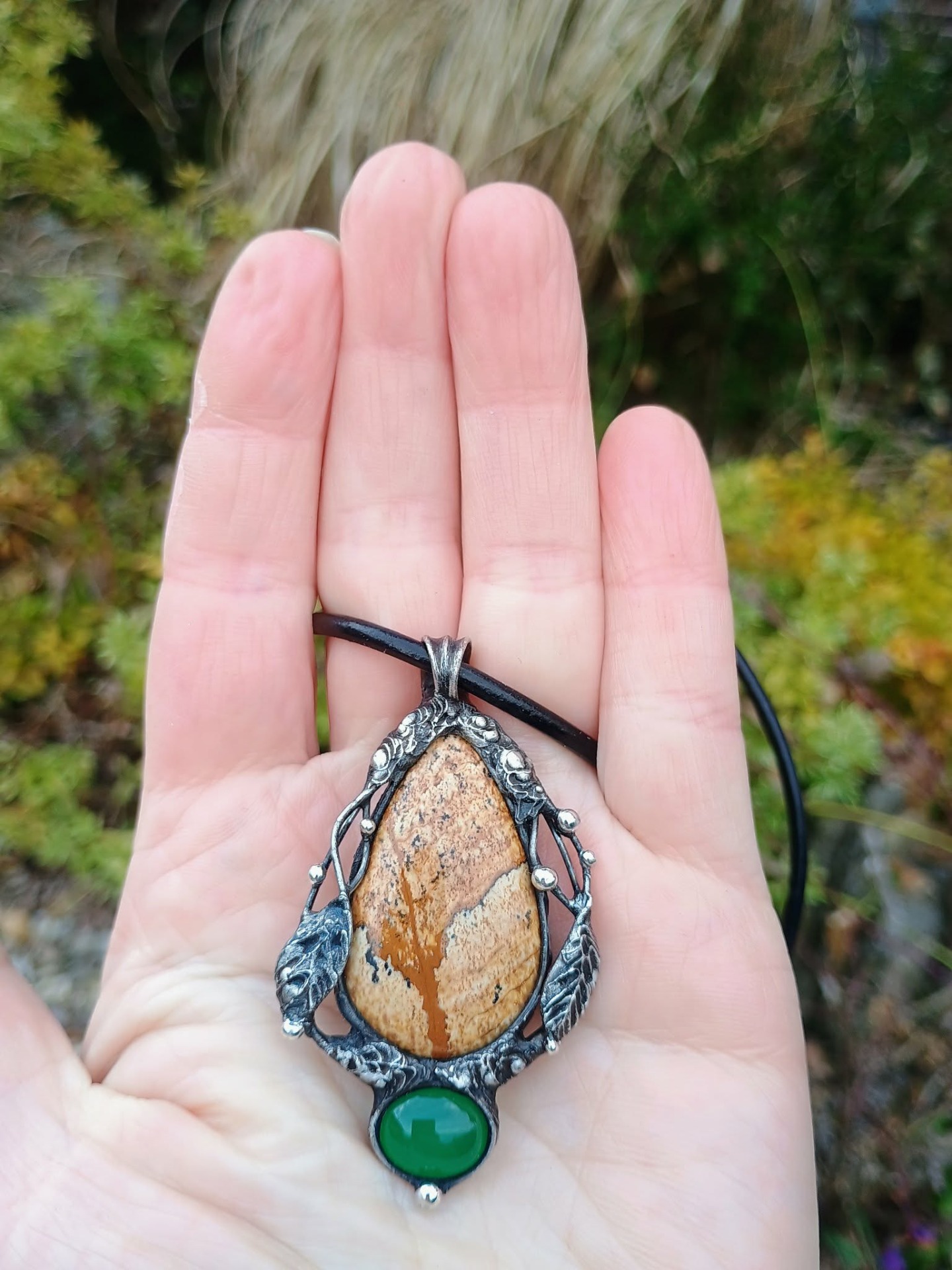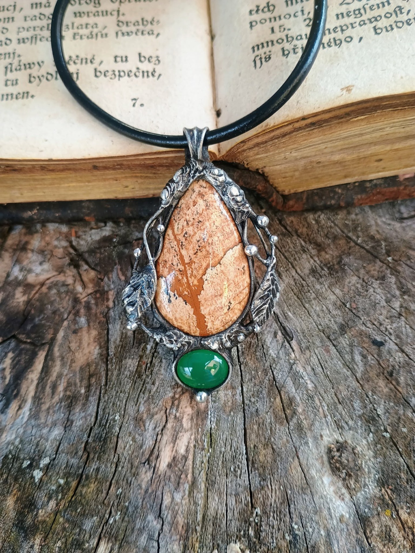 Zavěšeno na tmavé černé kůži 45 cm. Patinováno.