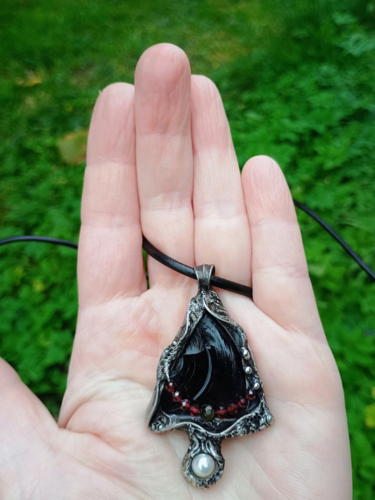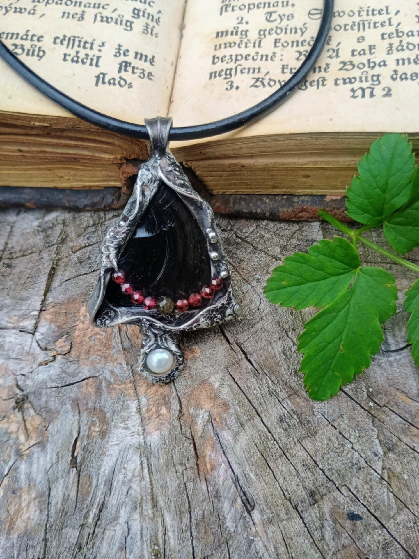 Vytvořeno z mědi, bezolovnatého cínu s příměsí stříbra, ze surového Černého obsidiánu, broušených korálků Granátu, Zlatého obsidiánu. Doplněno o říční perlu. Rozměr : 5,8 x 3,5 cm.